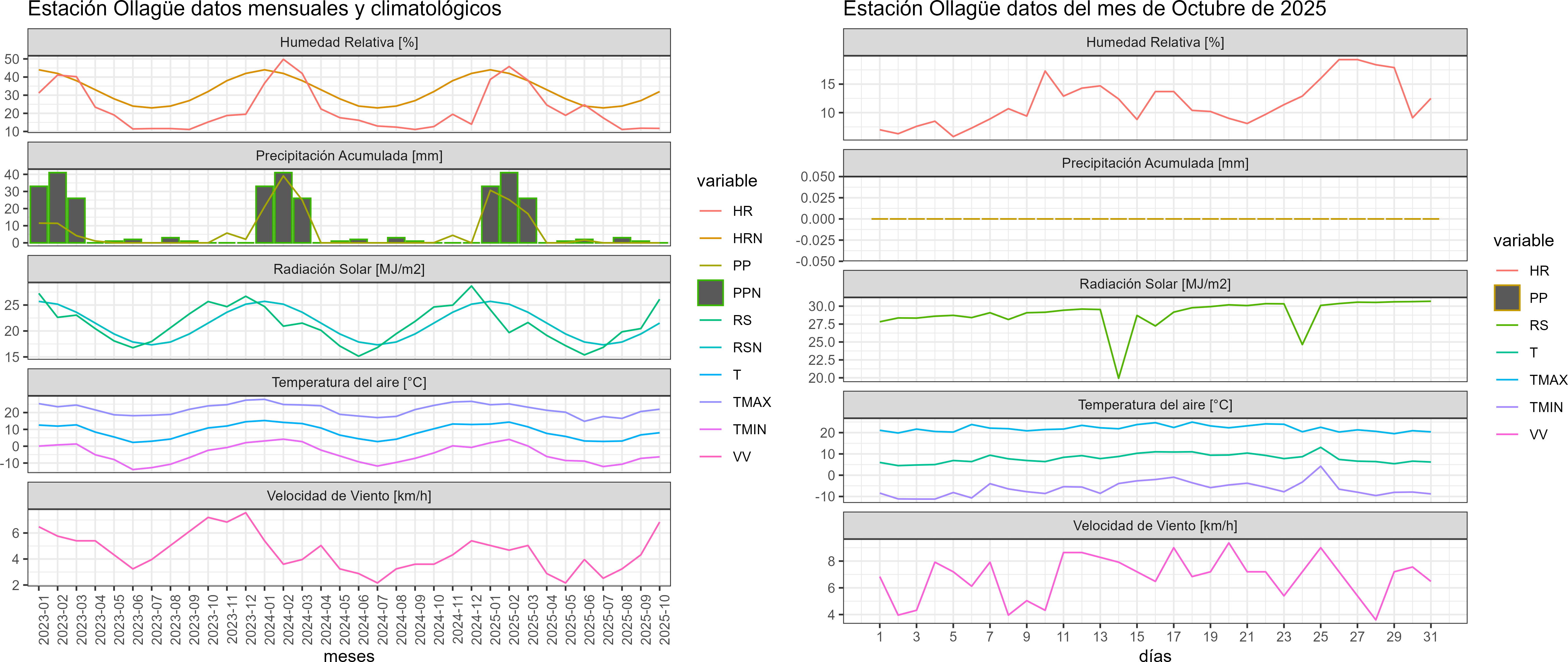 La estación Ollagüe corresponde al distrito agroclimático 15-3-5. Para este distrito climático la temperatura mínima, media y máxima climatológicas alcanzan los -4.1°C, 7.5°C y 19°C respectivamente. Por su parte, respecto a las temperaturas medidas durante el mes de octubre en la estación: la temperatura mínima alcanzo los -6.3°C (-2.2°C bajo la climatológica), la temperatura media 8°C (0.5°C sobre la climatológica) y la temperatura máxima llegó a los 22°C (3°C sobre la climatológica). En el mes de octubre se registró una pluviometría de 0 mm, lo cual representa un 0% con respecto al mismo mes de un año normal. De enero a octubre se ha registrado un total acumulado de 74.5 mm, en circunstancias que un año normal registraría a la fecha 153 mm, lo que representa un déficit de 51.3%. A la misma fecha, durante el año 2024 la precipitación alcanzaba los 0.1 mm.