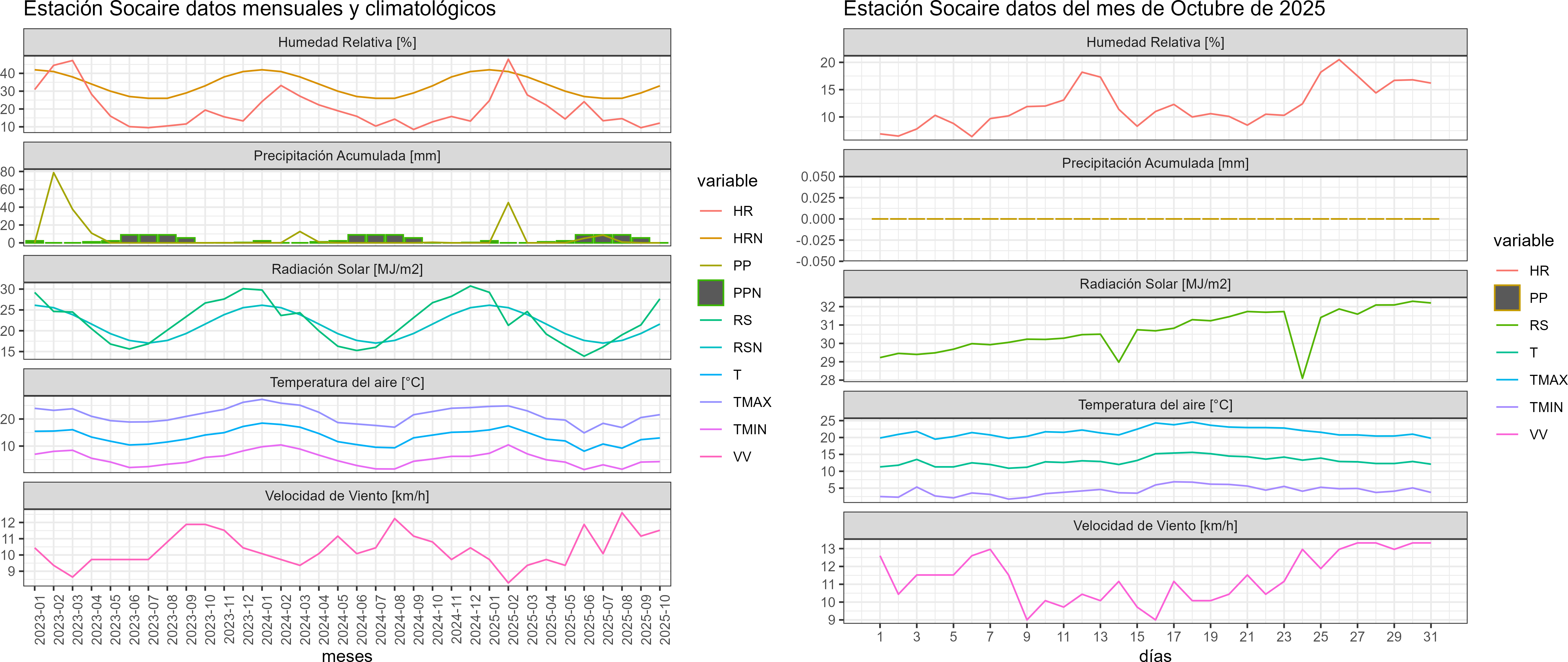 La estación Socaire corresponde al distrito agroclimático 15-3-4. Para este distrito climático la temperatura mínima, media y máxima climatológicas alcanzan los 2.6°C, 10.5°C y 18.4°C respectivamente. Por su parte, respecto a las temperaturas medidas durante el mes de octubre en la estación: la temperatura mínima alcanzo los 4.3°C (1.7°C sobre la climatológica), la temperatura media 13°C (2.5°C sobre la climatológica) y la temperatura máxima llegó a los 21.6°C (3.2°C sobre la climatológica). En el mes de octubre se registró una pluviometría de 0 mm, lo cual representa un 0% con respecto al mismo mes de un año normal. De enero a octubre se ha registrado un total acumulado de 59.7 mm, en circunstancias que un año normal registraría a la fecha 139 mm, lo que representa un déficit de 57.1%. A la misma fecha, durante el año 2024 la precipitación alcanzaba los 0.6 mm.