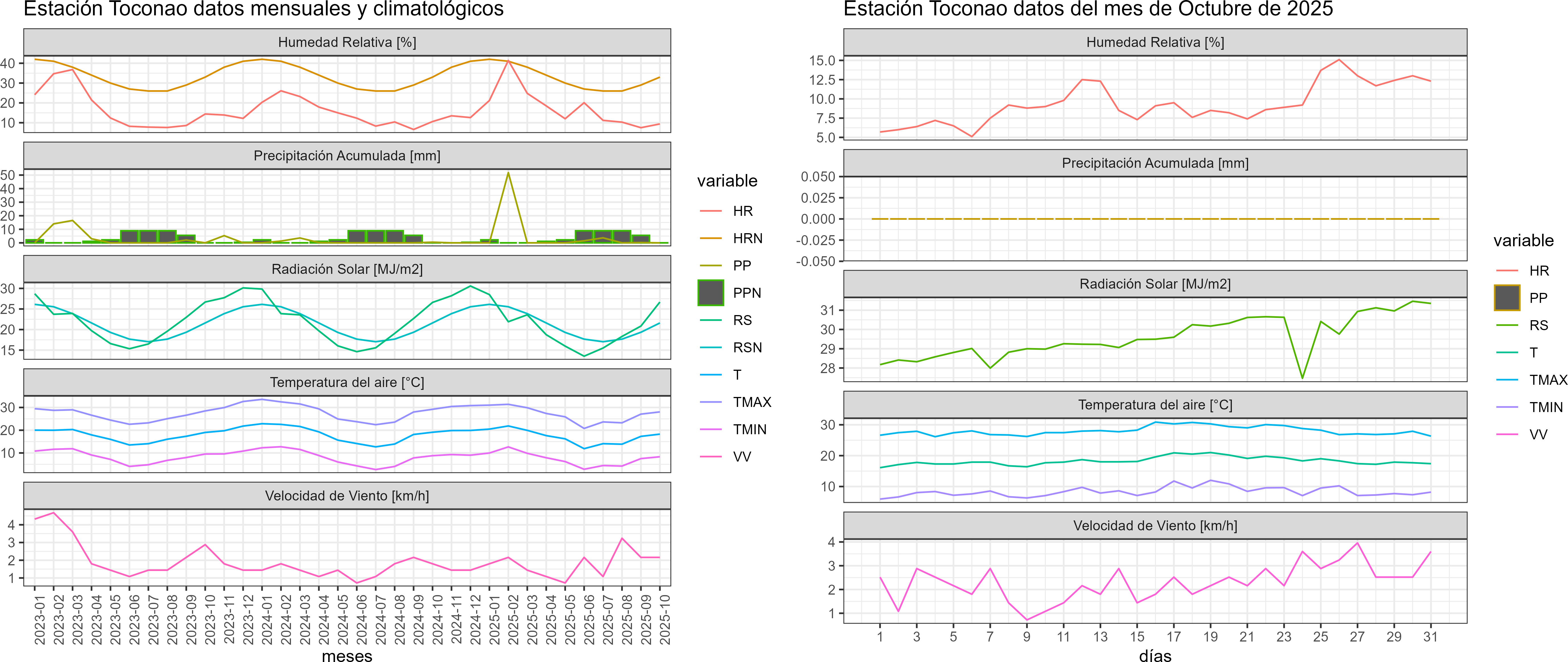 La estación Toconao corresponde al distrito agroclimático 15-3-4. Para este distrito climático la temperatura mínima, media y máxima climatológicas alcanzan los 6.5°C, 17.2°C y 28°C respectivamente. Por su parte, respecto a las temperaturas medidas durante el mes de octubre en la estación: la temperatura mínima alcanzo los 8.3°C (1.8°C sobre la climatológica), la temperatura media 18.3°C (1.1°C sobre la climatológica) y la temperatura máxima llegó a los 28.1°C (0.1°C sobre la climatológica). En el mes de octubre se registró una pluviometría de 0 mm. De enero a octubre se ha registrado un total acumulado de 57.2 mm, en circunstancias que un año normal registraría a la fecha 73 mm, lo que representa un déficit de 21.6%. A la misma fecha, durante el año 2024 la precipitación alcanzaba los 0.5 mm.