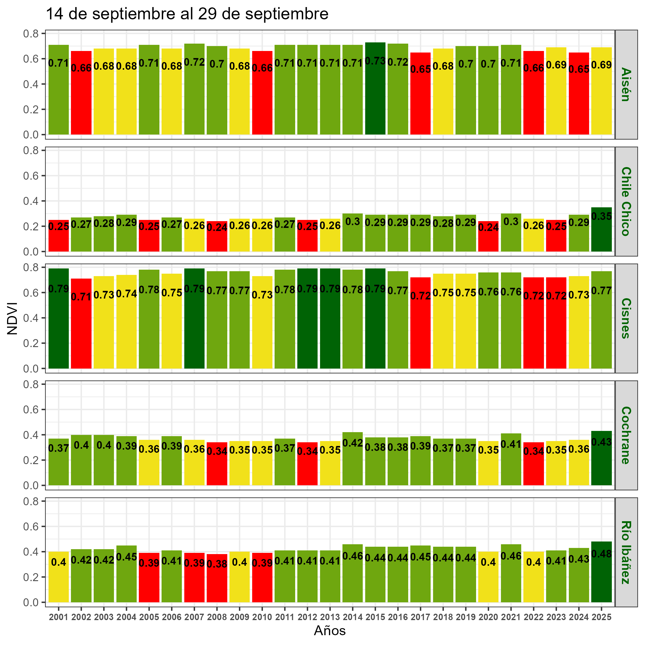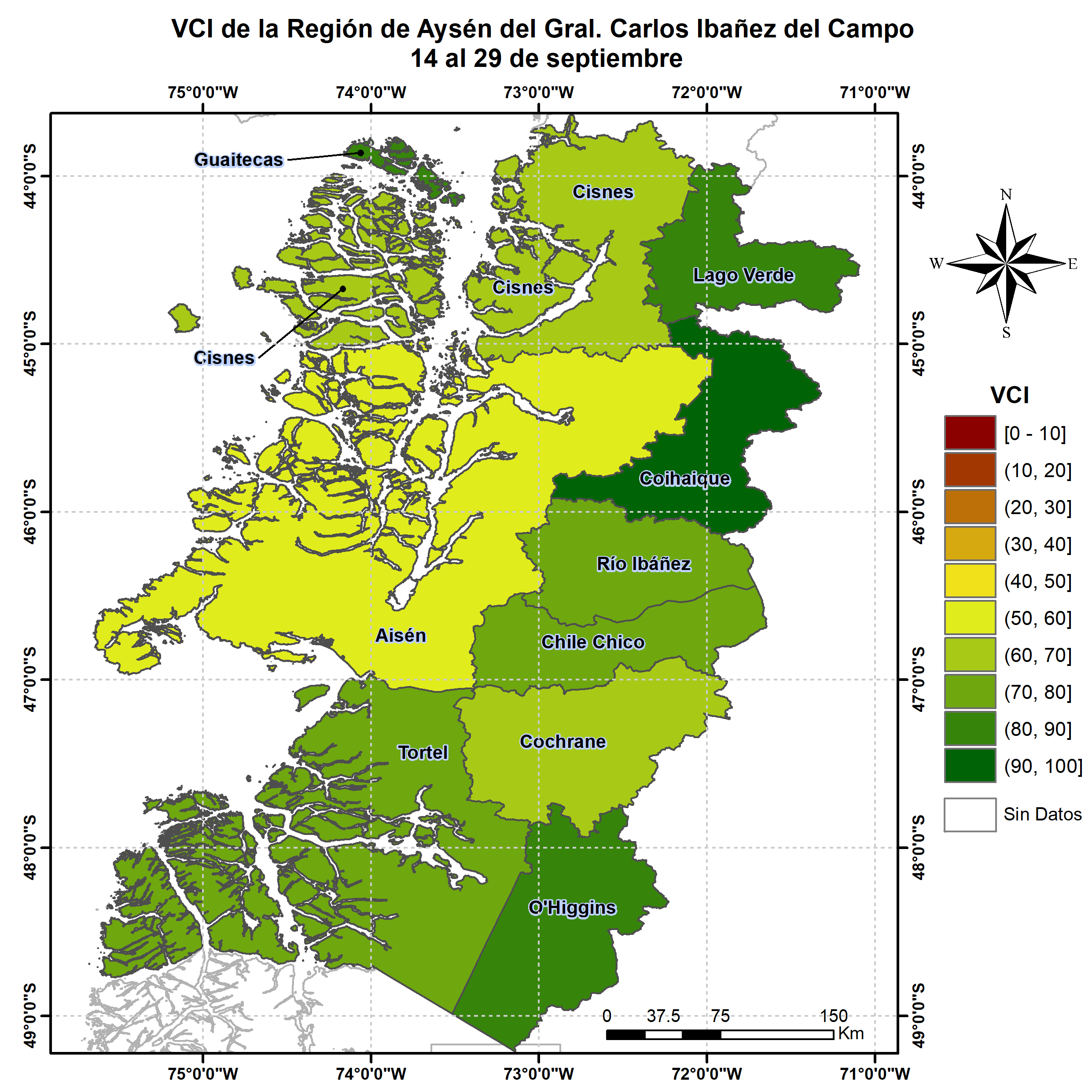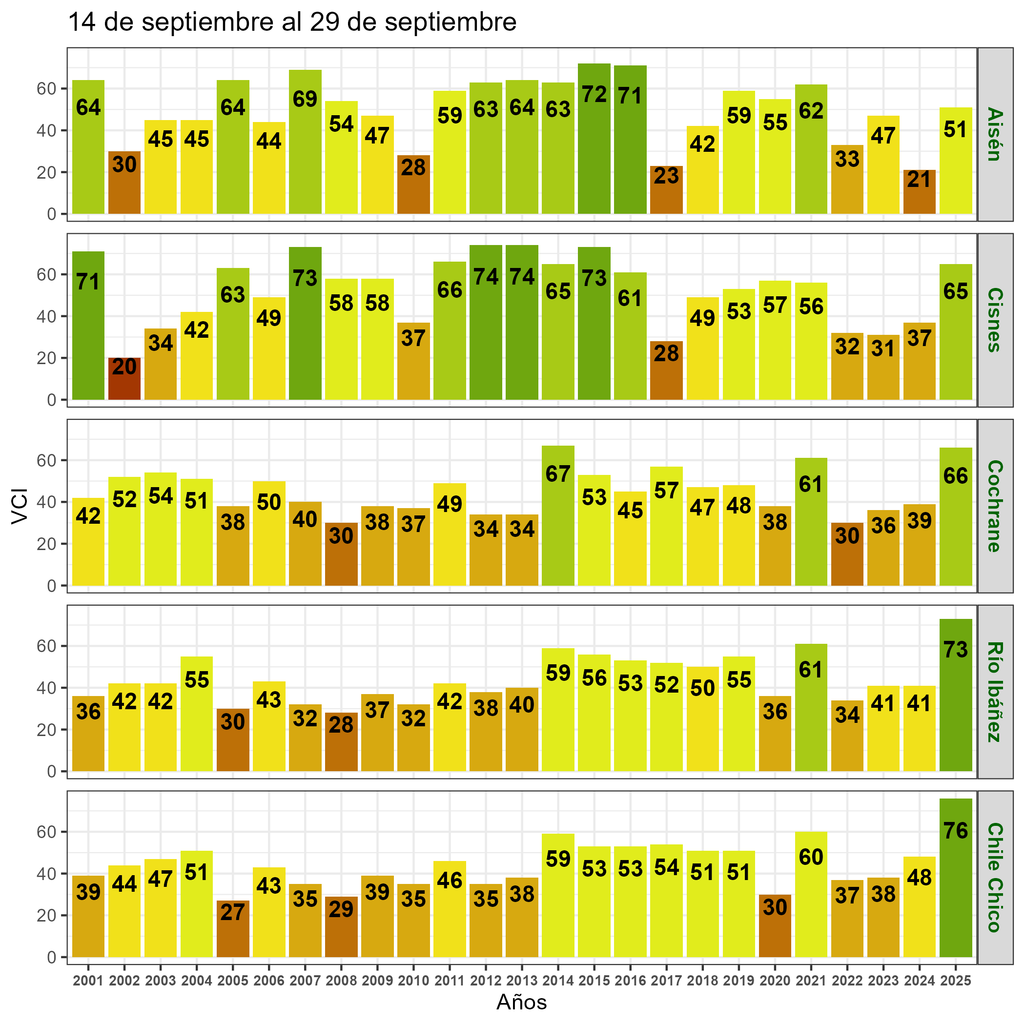 En términos globales la Región presentó un valor mediano de VCI de 70% para el período comprendido desde el 14 al 29 de septiembre. A igual período del año pasado presentaba un VCI de 30% (Fig. 1). De acuerdo a la Tabla 1 la Región de Aysén, en términos globales presenta una condición Favorable.