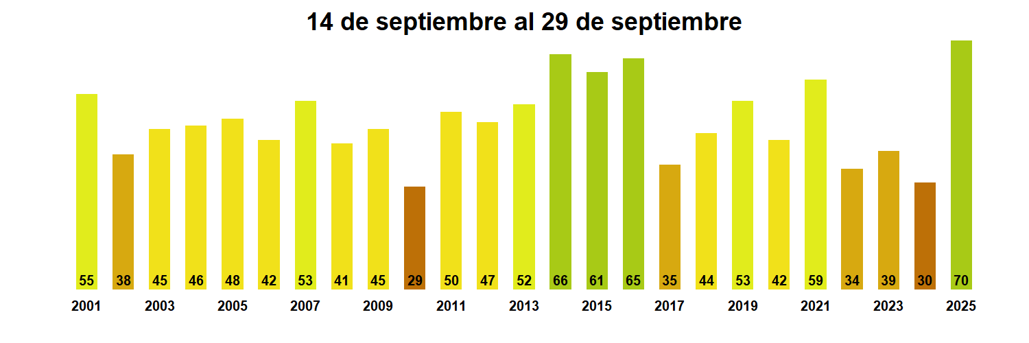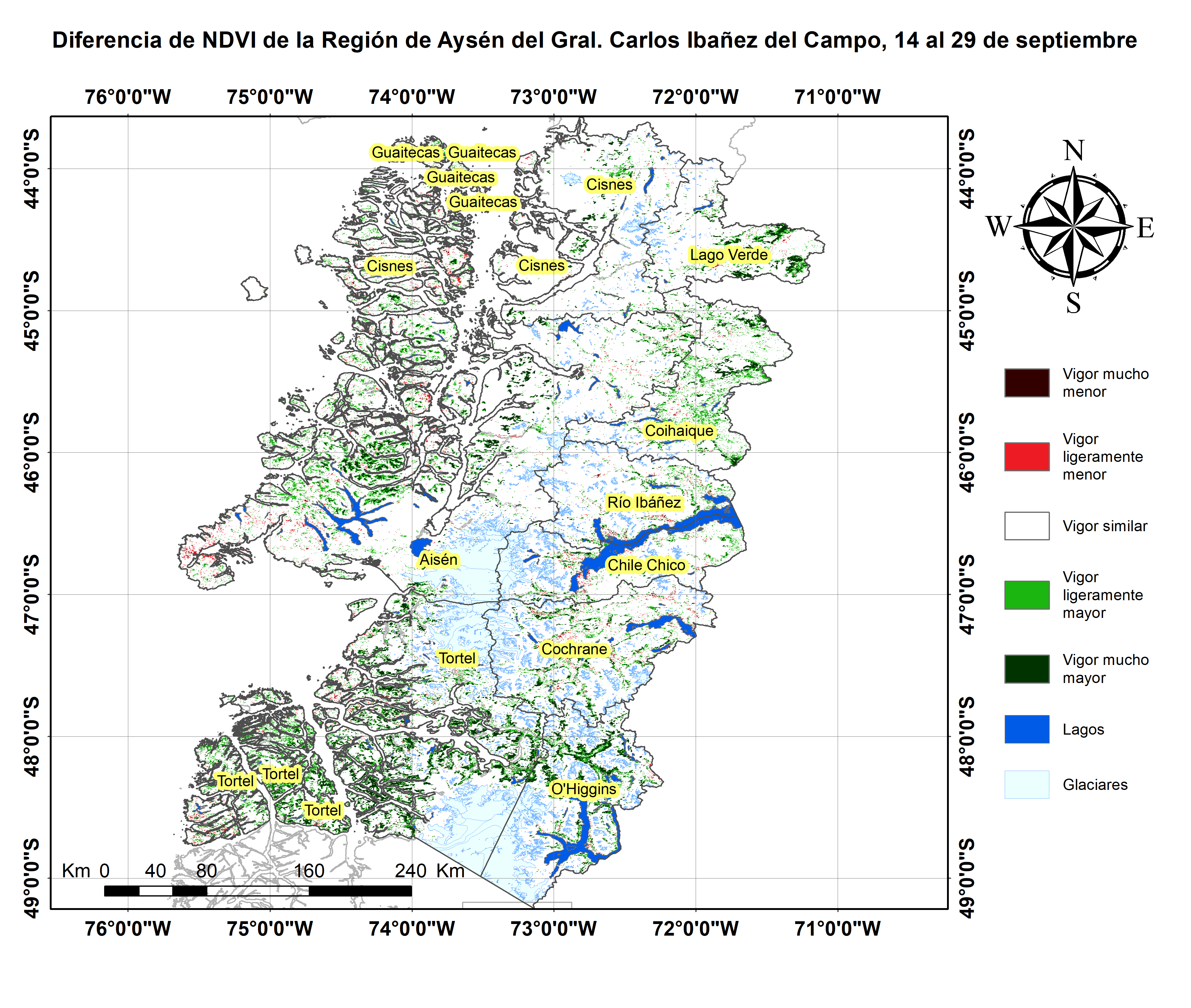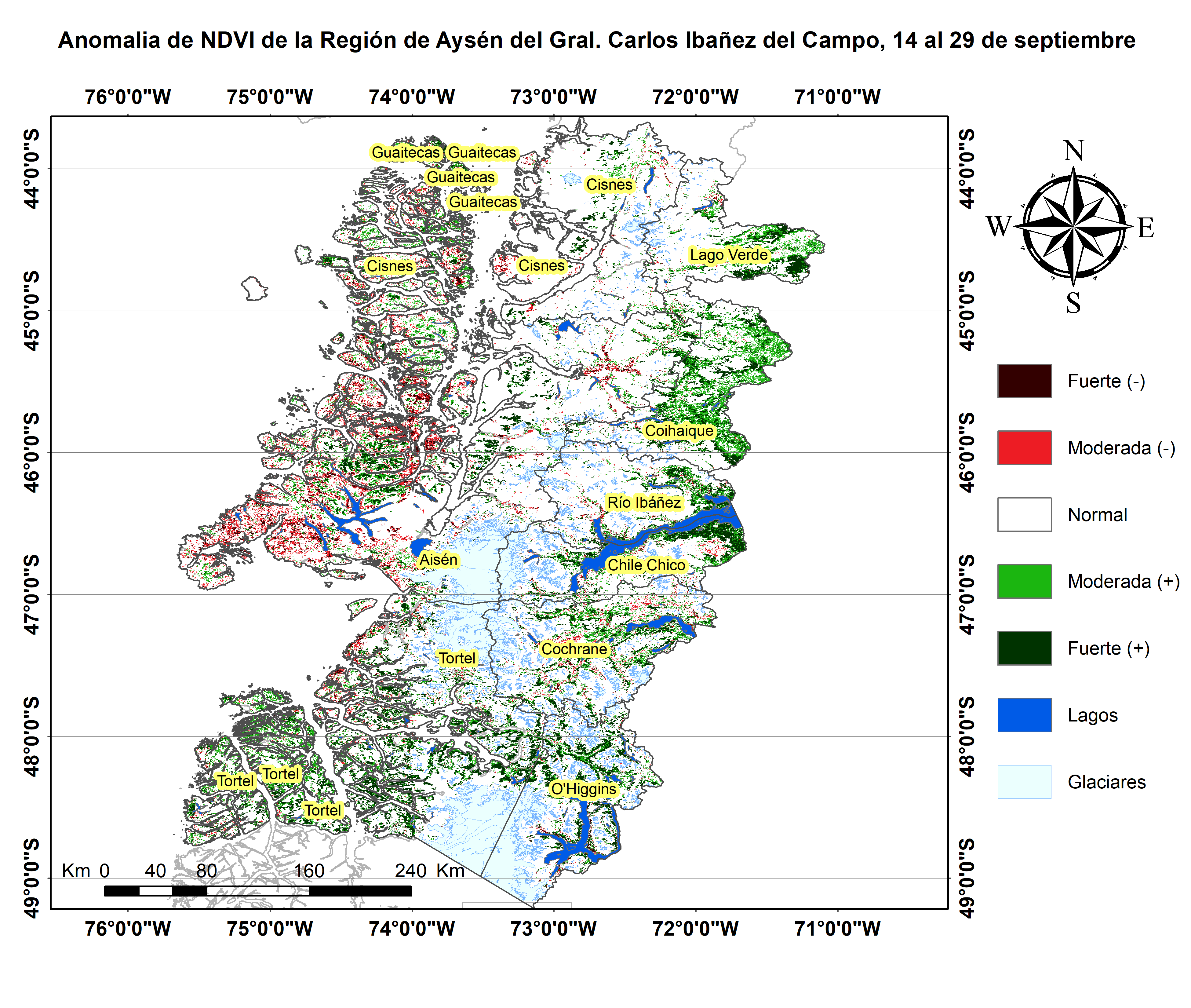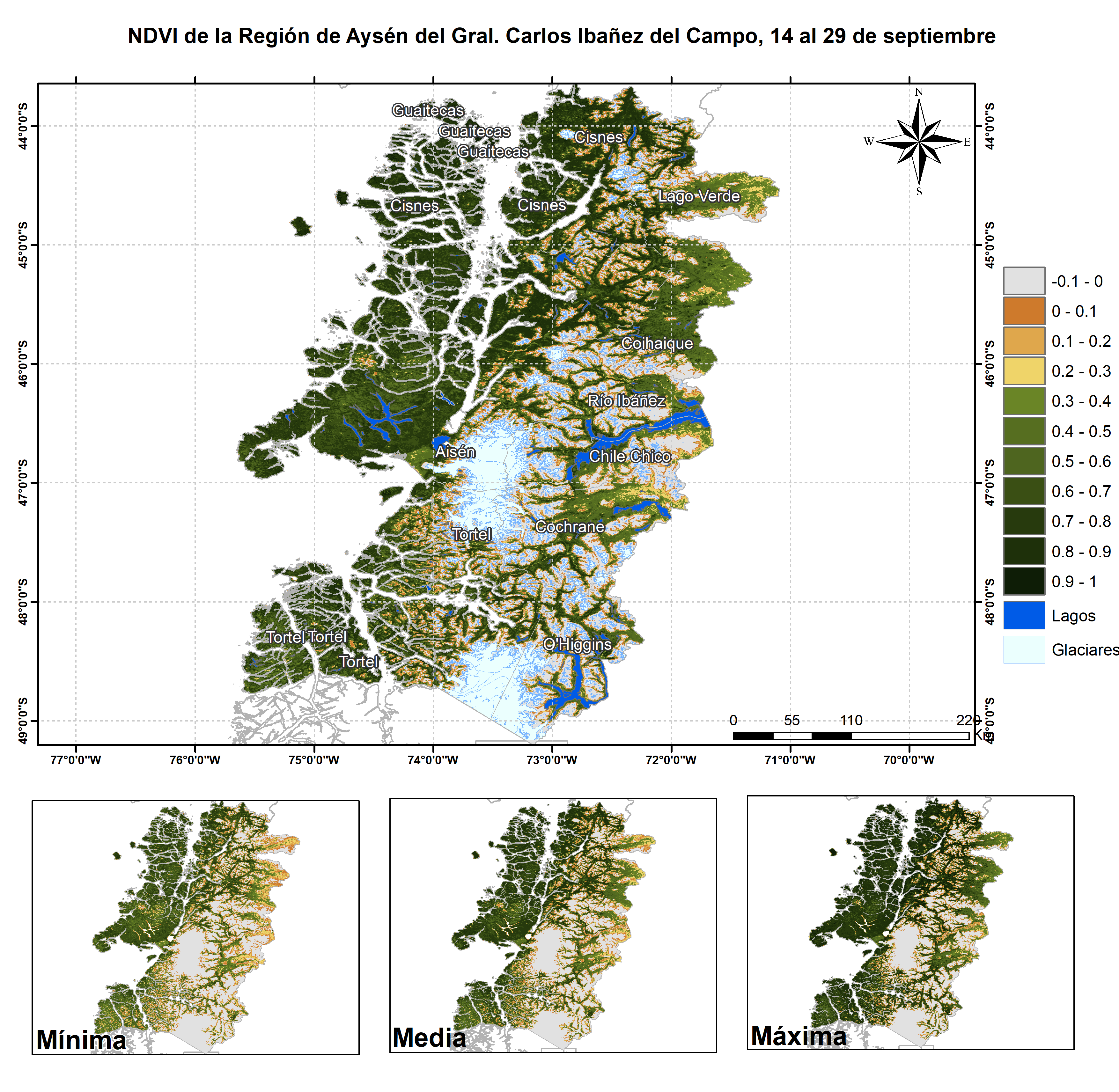 En términos globales la Región presentó un valor mediano de VCI de 70% para el período comprendido desde el 14 al 29 de septiembre. A igual período del año pasado presentaba un VCI de 30% (Fig. 1). De acuerdo a la Tabla 1 la Región de Aysén, en términos globales presenta una condición Favorable.