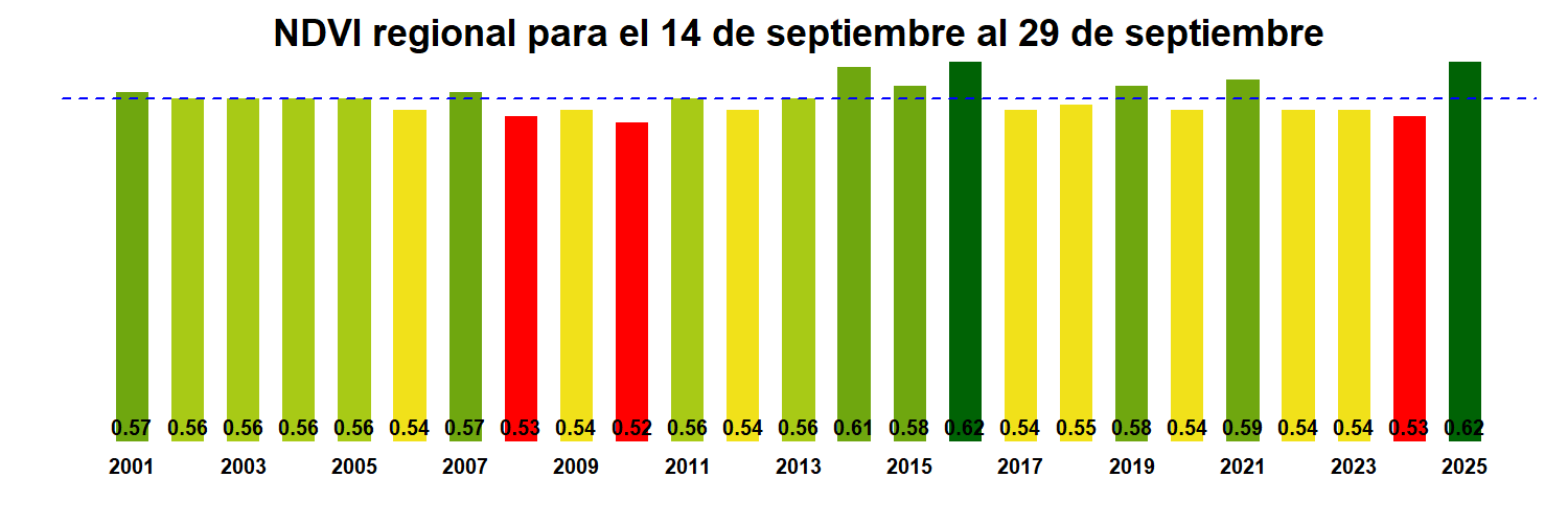 Para esta quincena se observa un NDVI promedio regional de 0.62 mientras el año pasado había sido de 0.53. El valor promedio histórico para esta región, en este período del año es de 0.56.