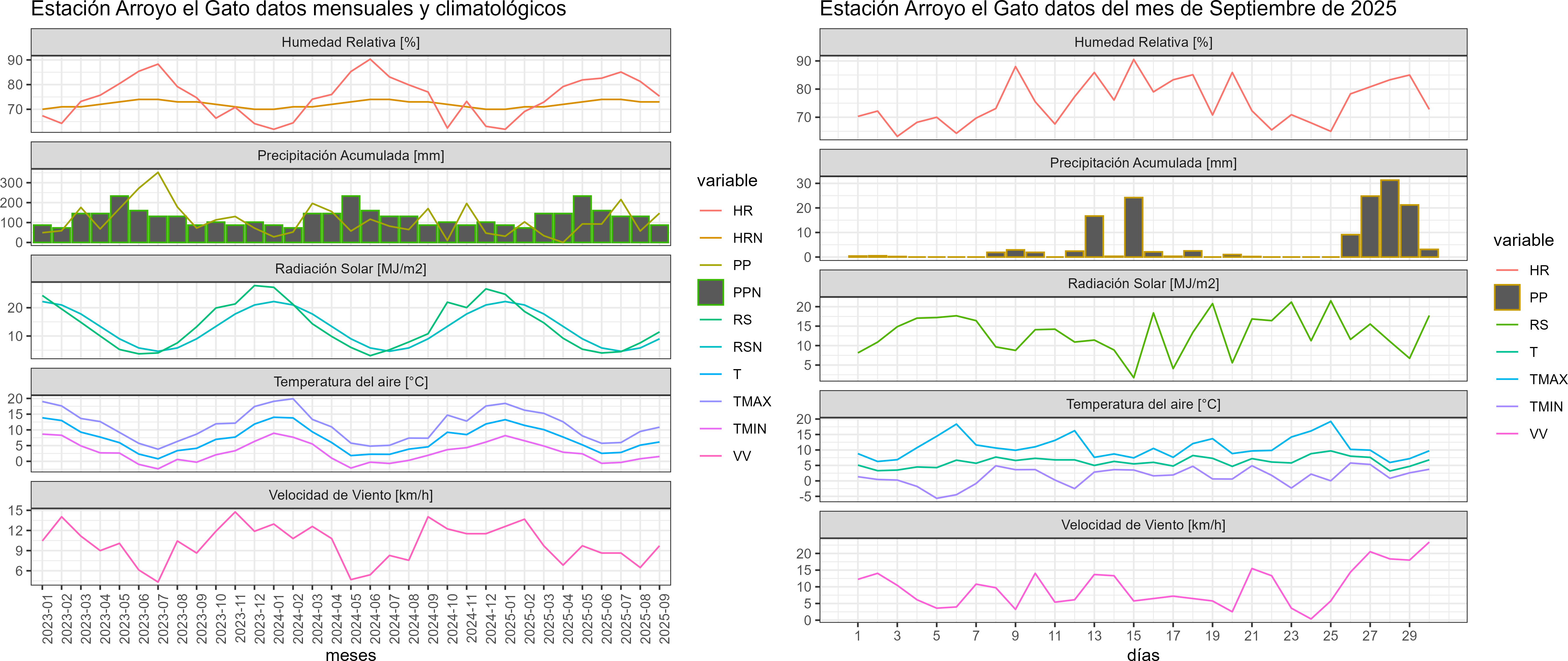 La estación Arroyo el Gato corresponde al distrito agroclimático 11-12-9. Para este distrito climático la temperatura mínima, media y máxima climatológicas alcanzan los 0.5°C, 4.9°C y 9.3°C respectivamente. Por su parte, respecto a las temperaturas medidas durante el mes de septiembre en la estación: la temperatura mínima alcanzo los 1.5°C (1°C sobre la climatológica), la temperatura media 6.1°C (1.2°C sobre la climatológica) y la temperatura máxima llegó a los 10.9°C (1.6°C sobre la climatológica). En esta localidad, se registraron seis eventosde heladas, con una temperatura mínima absoluta de -5,6°C. En el mes de septiembre se registró una pluviometría de 147 mm, lo cual representa un 196% con respecto al mismo mes de un año normal. De enero a septiembre se ha registrado un total acumulado de 774.1 mm, en circunstancias que un año normal registraría a la fecha 844 mm, lo que representa un déficit de 8.3%. A la misma fecha, durante el año 2024 la precipitación alcanzaba los 170.1 mm.