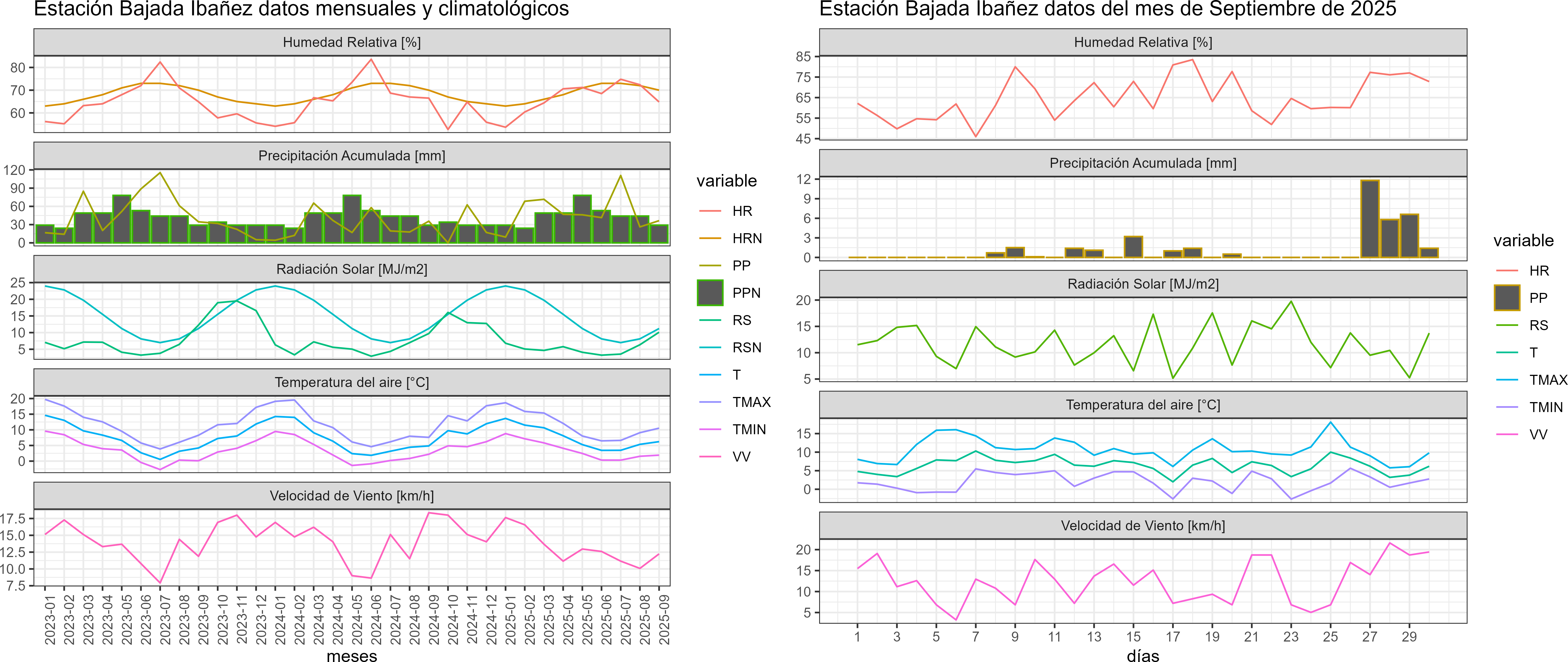 La estación Bajada Ibañez corresponde al distrito agroclimático 11-4. Para este distrito climático la temperatura mínima, media y máxima climatológicas alcanzan los 0.8°C, 4.7°C y 8.5°C respectivamente. Por su parte, respecto a las temperaturas medidas durante el mes de septiembre en la estación: la temperatura mínima alcanzo los 2°C (1.2°C sobre la climatológica), la temperatura media 6.4°C (1.7°C sobre la climatológica) y la temperatura máxima llegó a los 10.7°C (2.2°C sobre la climatológica). Sumado a lo anterior, se registraron siete eventos de heladas, con una temperatura mínima absoluta de -2,6°C. En el mes de septiembre se registró una pluviometría de 36.5 mm, lo cual representa un 50.7% con respecto al mismo mes de un año normal. De enero a septiembre se ha registrado un total acumulado de 457.6 mm, en circunstancias que un año normal registraría a la fecha 799 mm, lo que representa un déficit de 42.7%. A la misma fecha, durante el año 2024 la precipitación alcanzaba los 35.6 mm.