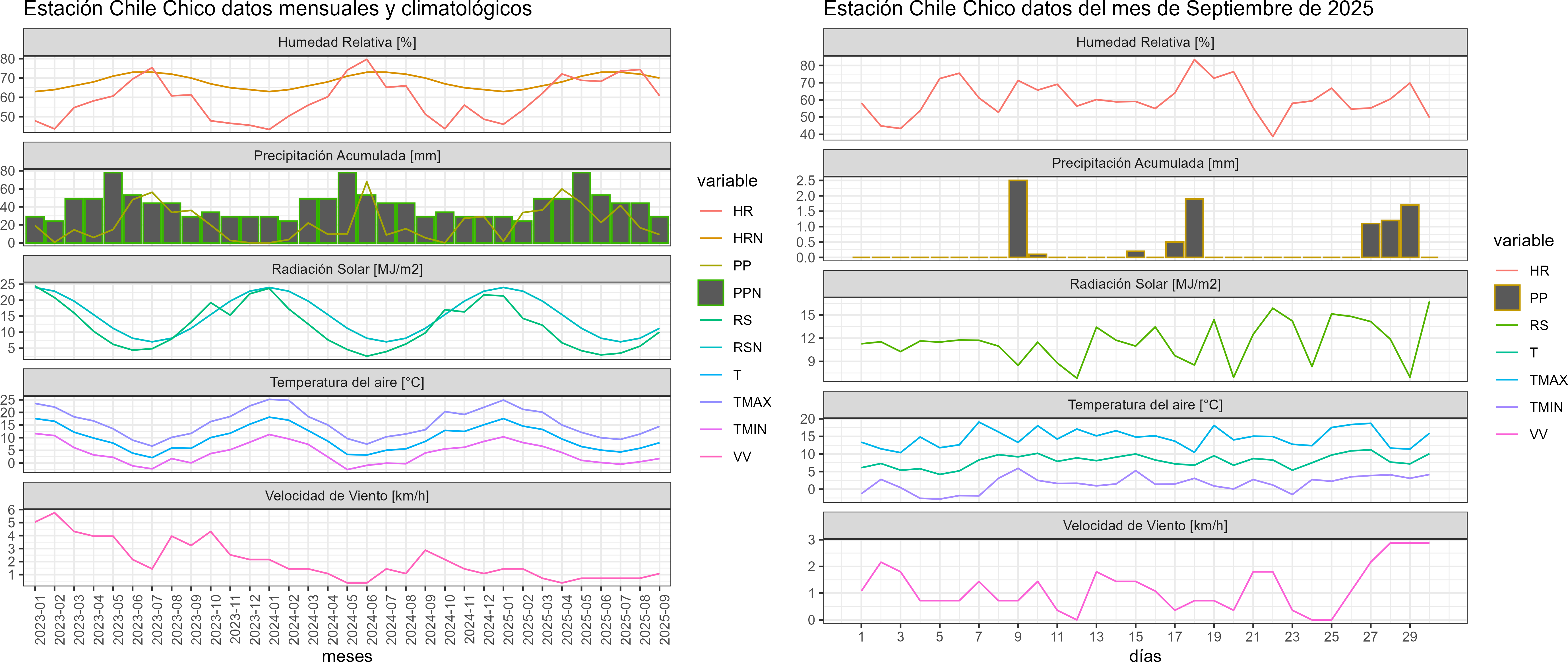 La estación Chile Chico corresponde al distrito agroclimático 11-4. Para este distrito climático la temperatura mínima, media y máxima climatológicas alcanzan los 2.8°C, 7.8°C y 12.8°C respectivamente. Por su parte, respecto a las temperaturas medidas durante el mes de septiembre en la estación: la temperatura mínima alcanzo los 1.6°C (-1.2°C bajo la climatológica), la temperatura media 8°C (0.2°C sobre la climatológica) y la temperatura máxima llegó a los 14.6°C (1.8°C sobre la climatológica). En esta localidad, se registraron seis eventos de heladas, con una temperatura mínima absoluta de -2,8°C. En el mes de septiembre se registró una pluviometría de 9.2 mm, lo cual representa un 57.5% con respecto al mismo mes de un año normal. De enero a septiembre se ha registrado un total acumulado de 266.1 mm, en circunstancias que un año normal registraría a la fecha 222 mm, lo que representa un superávit de 19.9%. A la misma fecha, durante el año 2024 la precipitación alcanzaba los 5.6 mm.
