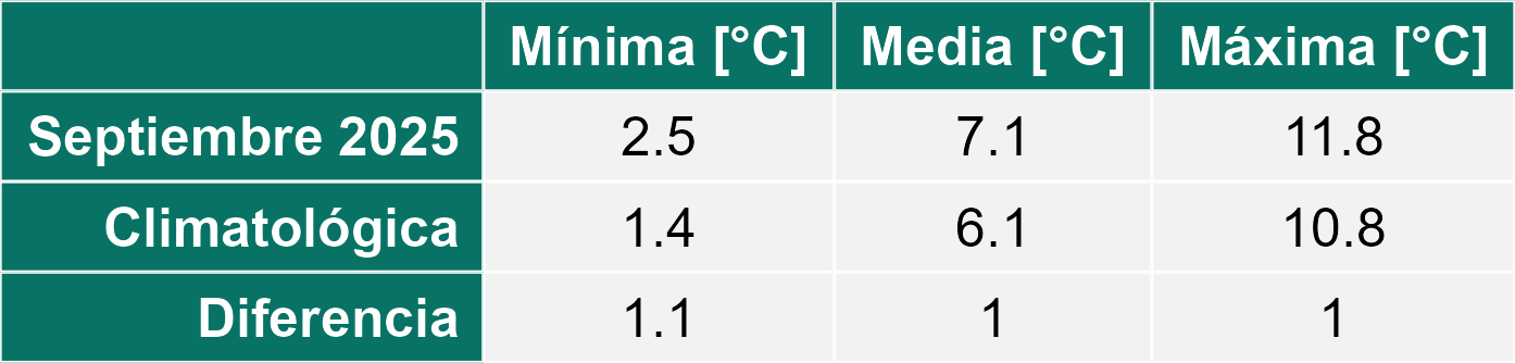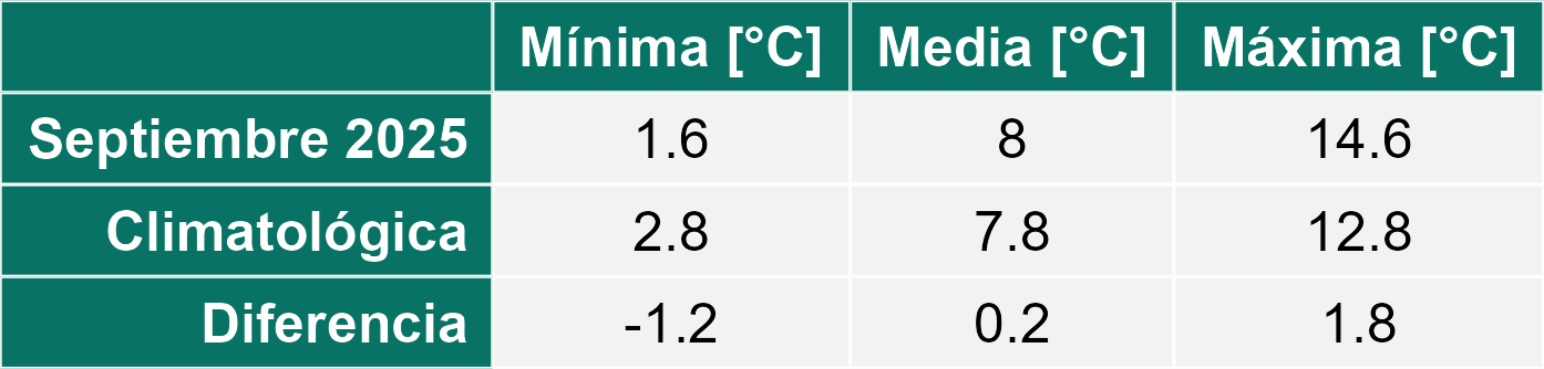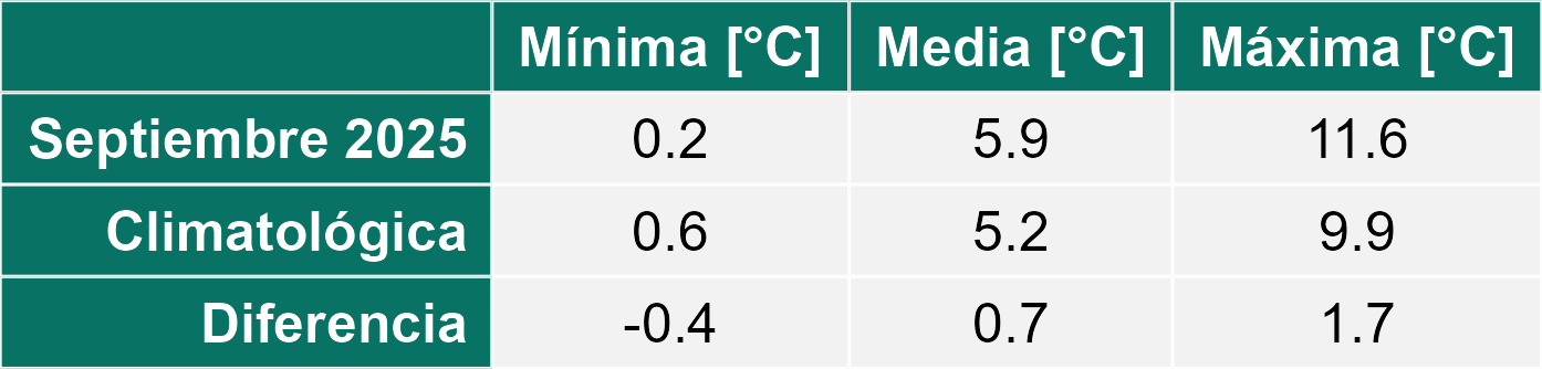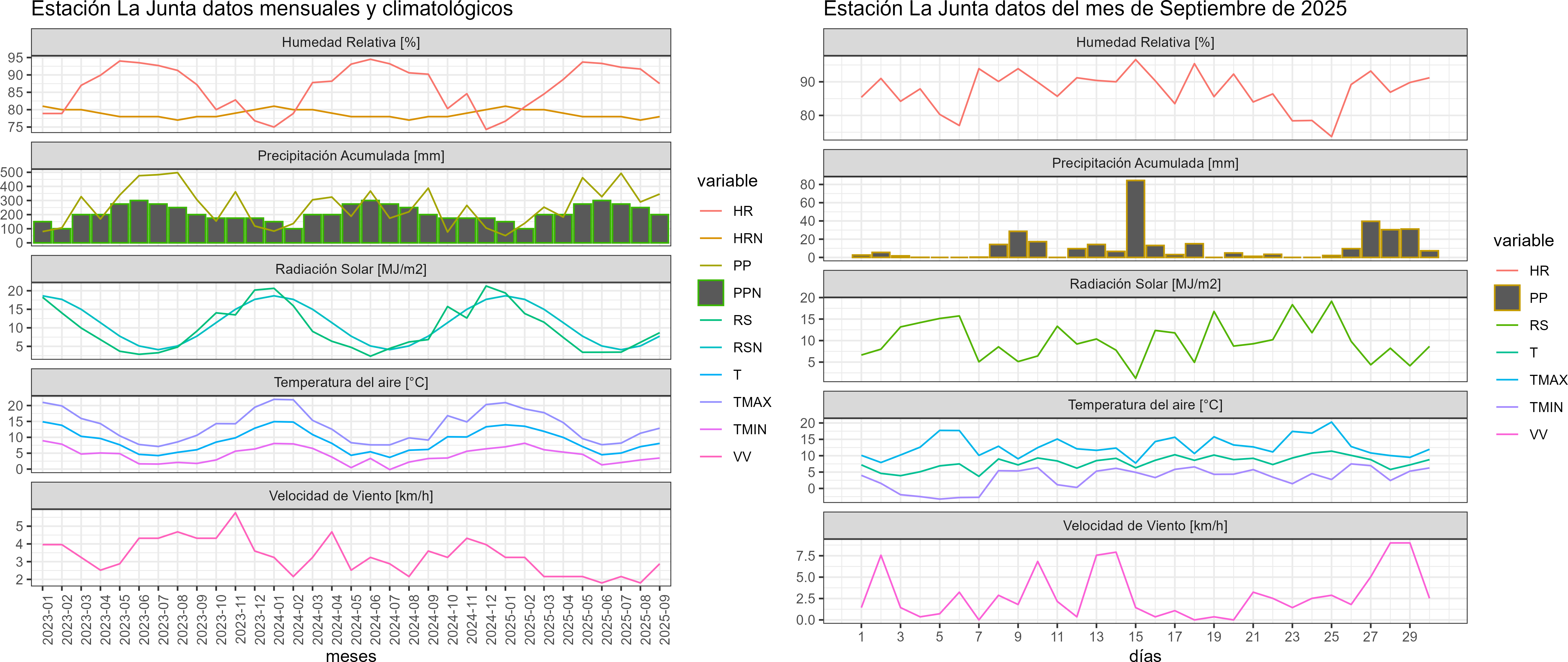 La estación La Junta corresponde al distrito agroclimático 10-11-1. Para este distrito climático la temperatura mínima, media y máxima climatológicas alcanzan los 2.5°C, 6.7°C y 10.9°C respectivamente. Por su parte, respecto a las temperaturas medidas durante el mes de septiembre en la estación: la temperatura mínima alcanzo los 3.3°C (0.8°C sobre la climatológica), la temperatura media 7.9°C (1.2°C sobre la climatológica) y la temperatura máxima llegó a los 12.8°C (1.9°C sobre la climatológica). Además, se registraron cinco eventos de heladas con una temperatura mínima absoluta de -3,2°C. En el mes de septiembre se registró una pluviometría de 345.9 mm, lo cual representa un 173.8% con respecto al mismo mes de un año normal. De enero a septiembre se ha registrado un total acumulado de 2542.7 mm, en circunstancias que un año normal registraría a la fecha 2050 mm, lo que representa un superávit de 24%. A la misma fecha, durante el año 2024 la precipitación alcanzaba los 387.8 mm.