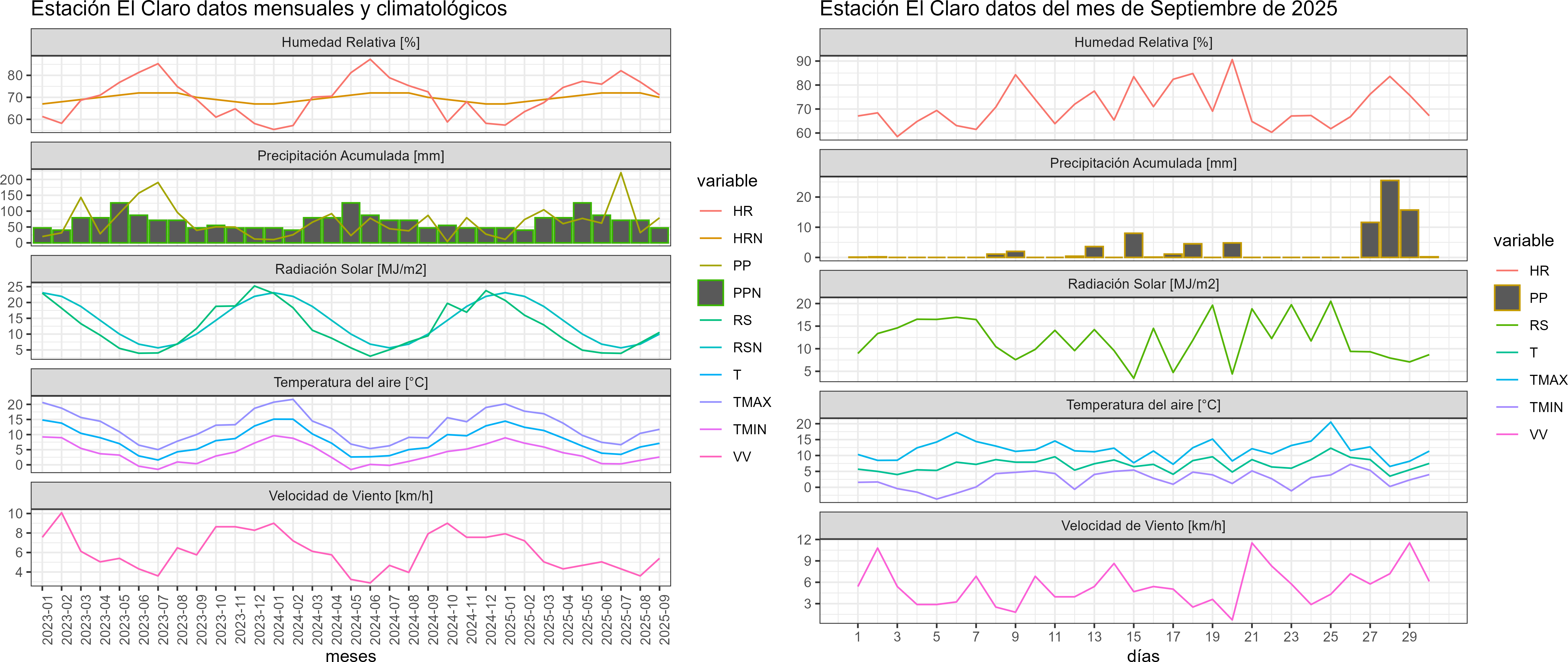 La estación El Claro corresponde al distrito agroclimático 11-3. Para este distrito climático la temperatura mínima, media y máxima climatológicas alcanzan los 1.4°C, 6.1°C y 10.8°C respectivamente. Por su parte, respecto a las temperaturas medidas durante el mes de septiembre en la estación: la temperatura mínima alcanzo los 2.5°C (1.1°C sobre la climatológica), la temperatura media 7.1°C (1°C sobre la climatológica) y la temperatura máxima llegó a los 11.8°C (1°C sobre la climatológica). Sumado a lo anterior, se registraron seis eventos de heladas, con una temperatura mínima absoluta de -3,7°C. En el mes de septiembre se registró una pluviometría de 78.9 mm, lo cual representa un 133.7% con respecto al mismo mes de un año normal. De enero a septiembre se ha registrado un total acumulado de 720.9 mm, en circunstancias que un año normal registraría a la fecha 728 mm, lo que representa un déficit de 1%. A la misma fecha, durante el año 2024 la precipitación alcanzaba los 86.6 mm.