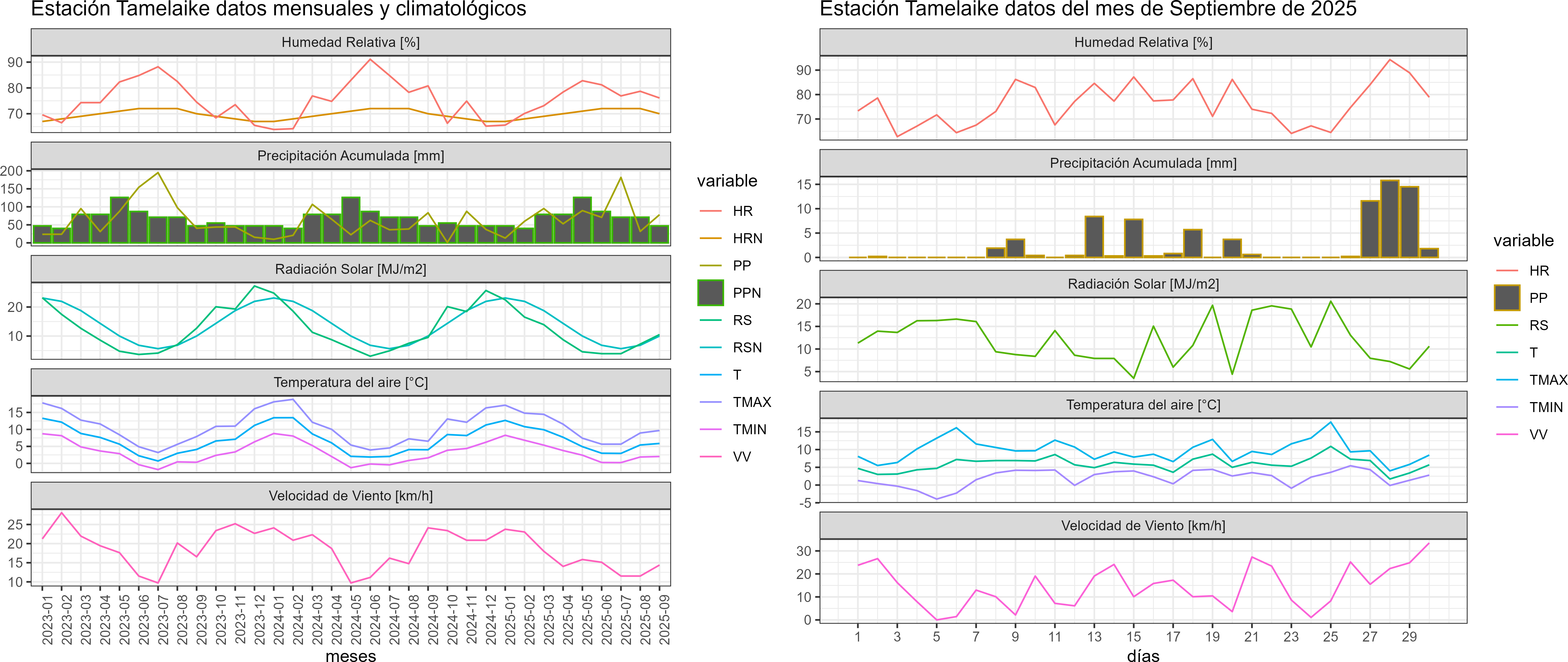 La estación Tamelaike corresponde al distrito agroclimático 11-3. Para este distrito climático la temperatura mínima, media y máxima climatológicas alcanzan los 0.8°C, 5.3°C y 9.7°C respectivamente. Por su parte, respecto a las temperaturas medidas durante el mes de septiembre en la estación: la temperatura mínima alcanzo los 2°C (1.2°C sobre la climatológica), la temperatura media 5.9°C (0.6°C sobre la climatológica) y la temperatura máxima llegó a los 9.7°C (Igual la climatológico). Sumado a lo anterior, se registraron siete eventos de heladas, con una temperatura mínima absoluta de -4,0°C. En el mes de septiembre se registró una pluviometría de 78.1 mm, lo cual representa un 93% con respecto al mismo mes de un año normal. De enero a septiembre se ha registrado un total acumulado de 672.9 mm, en circunstancias que un año normal registraría a la fecha 945 mm, lo que representa un déficit de 28.8%. A la misma fecha, durante el año 2024 la precipitación alcanzaba los 83.4 mm.