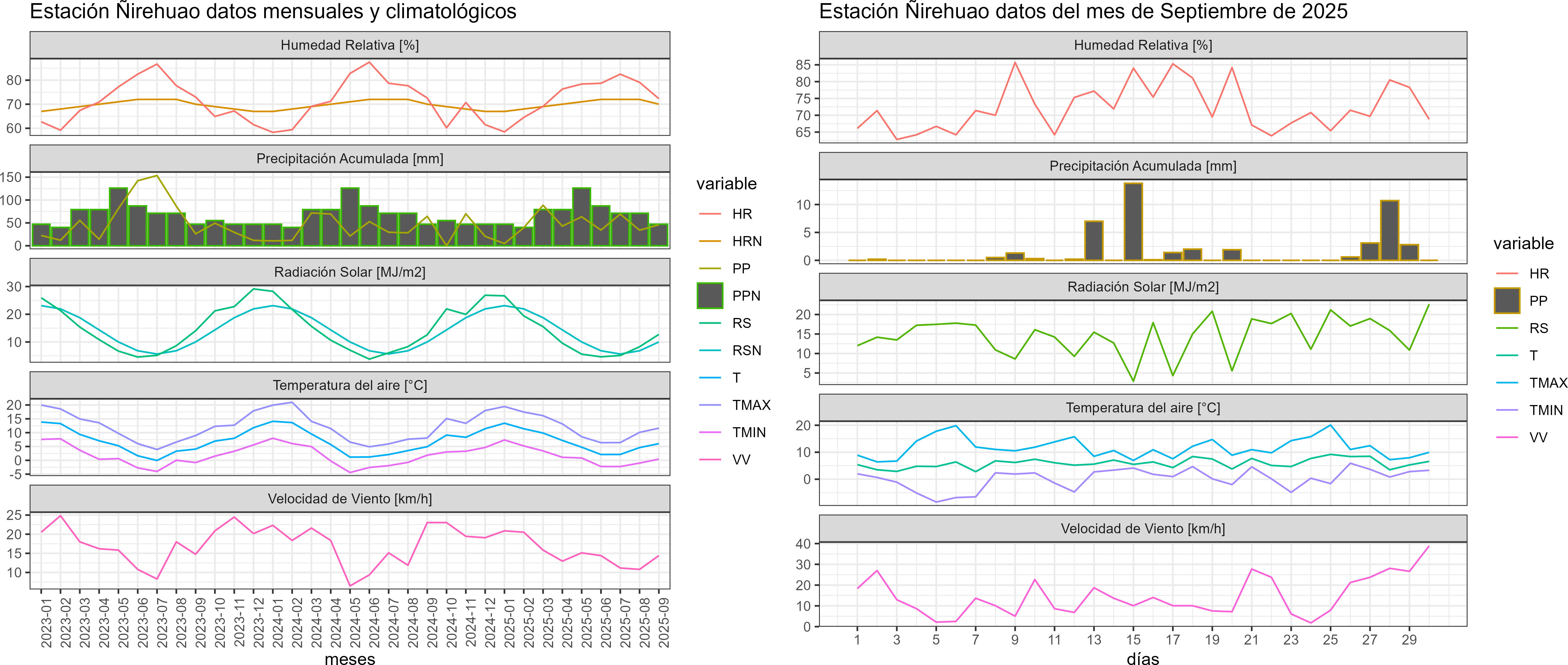 La estación Ñirehuao corresponde al distrito agroclimático 11-3. Para este distrito climático la temperatura mínima, media y máxima climatológicas alcanzan los 0.6°C, 5.2°C y 9.9°C respectivamente. Por su parte, respecto a las temperaturas medidas durante el mes de septiembre en la estación: la temperatura mínima alcanzo los 0.2°C (-0.4°C bajo la climatológica), la temperatura media 5.9°C (0.7°C sobre la climatológica) y la temperatura máxima llegó a los 11.6°C (1.7°C sobre la climatológica). En esta localidad, se registraron nueve eventos de heladas, con una temperatura mínima absoluta de -8,5°C. En el mes de septiembre se registró una pluviometría de 45.9 mm, lo cual representa un 99.8% con respecto al mismo mes de un año normal. De enero a septiembre se ha registrado un total acumulado de 422.6 mm, en circunstancias que un año normal registraría a la fecha 550 mm, lo que representa un déficit de 23.2%. A la misma fecha, durante el año 2024 la precipitación alcanzaba los 64.4 mm.