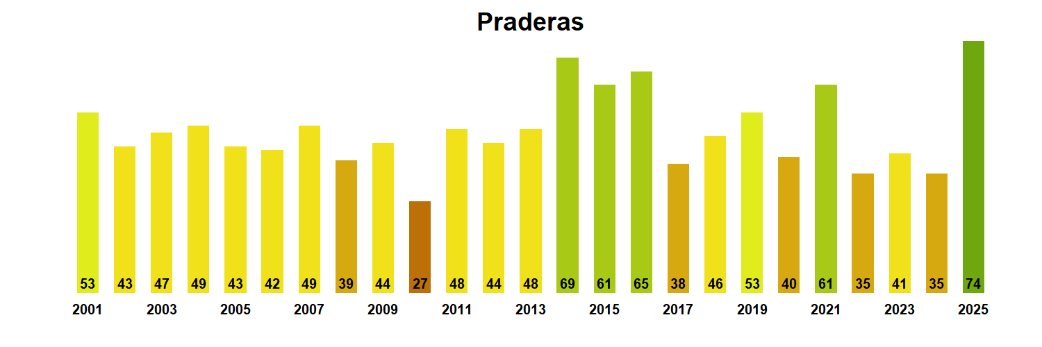 La Zona Húmeda acumuló 271,2 mm de precipitación, un 49% sobre el promedio histórico (181 mm). La temperatura media fue de 8,0°C (vs 7,1°C), favorecida por mínimas y máximas más altas. Estas condiciones mejoraron respecto a meses previos, permitiendo observar rebrote verde en las praderas. Sin embargo, es importante restringir el pastoreo en potreros con agua estancada, dado el riesgo de Fasciola hepática (Saguaypé). Asimismo, se recomienda continuar monitoreando la presencia de cuncunilla negra, aplicando control cuando se detecten 2 o más larvas por palada de suelo.