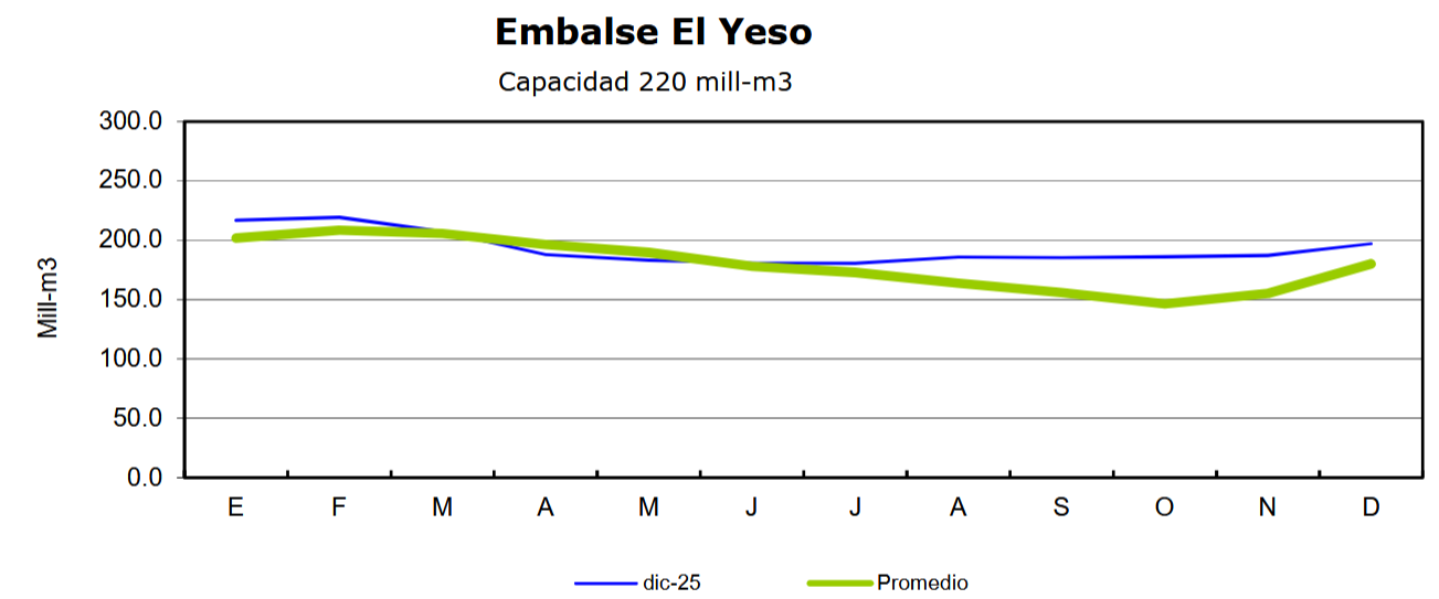 Finalmente, el Embalse El Yeso alcanzó al 31 de diciembre un volumen de 196,8 millones de m3, lo que corresponde al 89% de su capacidad total. Este nivel representa un 5,7% menor que en diciembre de 2024 (208,4 millones m3) y un 9,5% superior al promedio histórico mensual (180 millones m3).