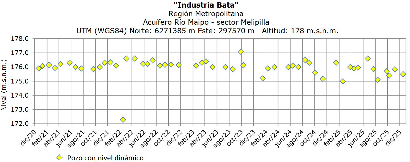 En el sector Melipilla, el pozo Industria Bata se mantiene con niveles dinámicos cercanos a los 175,5 m.s.n.m., equivalente a una profundidad de aproximadamente 2,5 m bajo la superficie, dentro del rango estable de los últimos años.