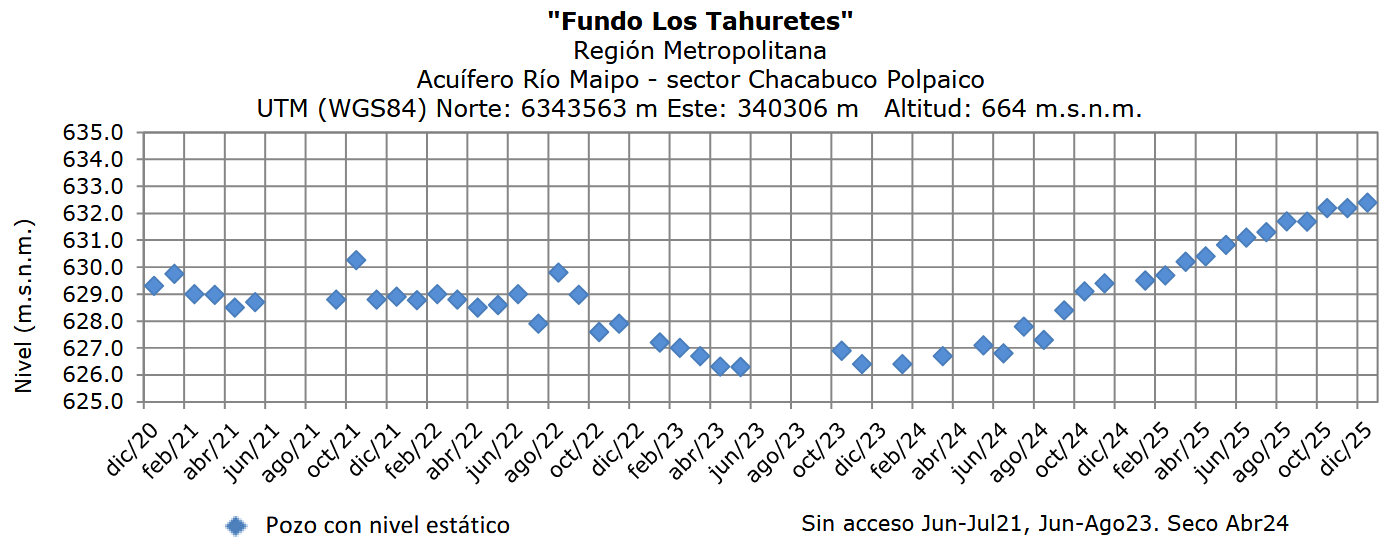 En el sector Chacabuco/Polpaico, el pozo Fundo Los Tahuretes continúa con un claro proceso de recuperación, alcanzando en diciembre 2025 un nivel estático cercano a los 632 m.s.n.m., reafirmando la tendencia al alza registrada durante este año, manteniéndose en valores similares a los meses previos.