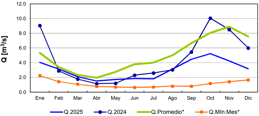 Para el período de diciembre en la estación Los Almendros de Río Mapocho, el caudal fue de 3,2 m3/s, lo que representa un valor 57,9% menor respecto al promedio histórico de este mes (7,6 m3/s) y un 46,7% inferior al registro de diciembre de 2024 (6,0 m3/s). En comparación con noviembre de 2025 (4,2 m3/s), se observa un descenso mensual de 23,8%.