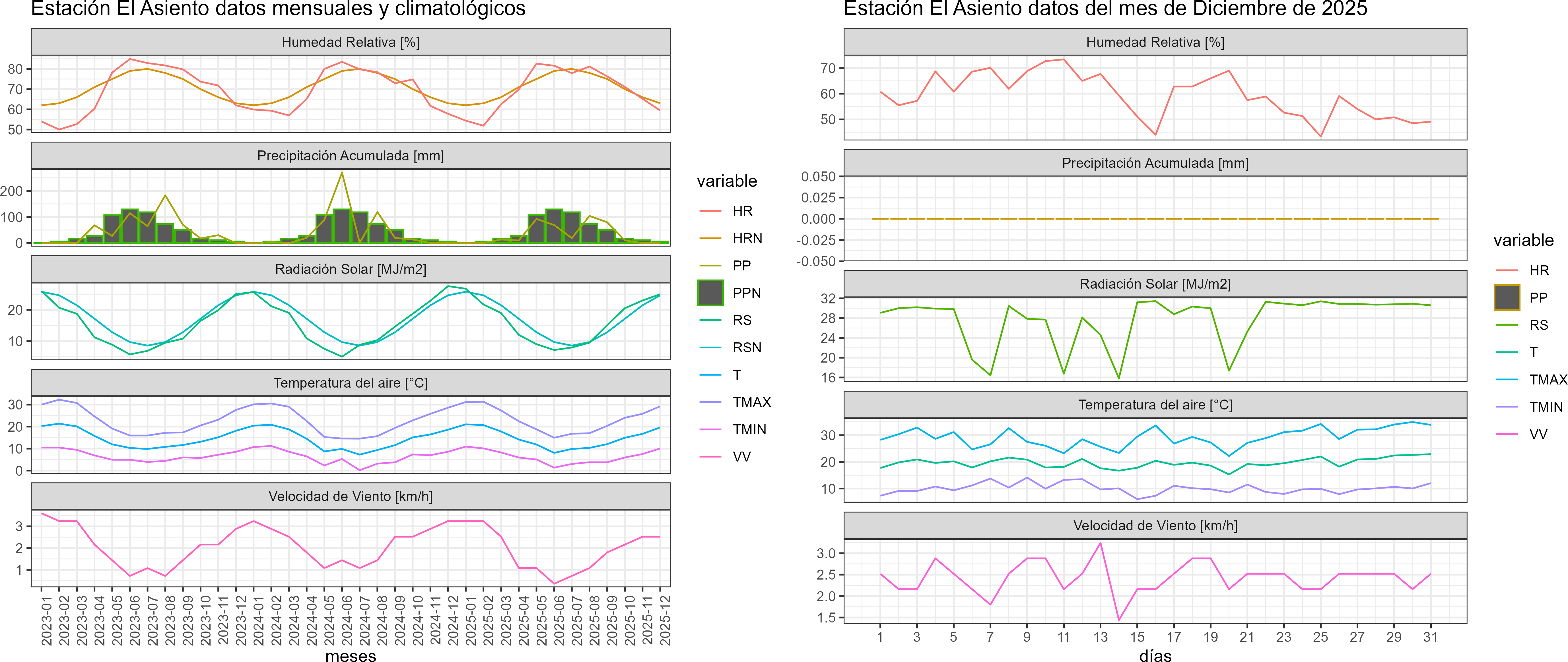 La estación El Asiento corresponde al distrito agroclimático 13-6-1. Para este distrito climático la temperatura mínima, media y máxima climatológicas alcanzan los 10.5°C, 18.9°C y 27.3°C respectivamente. Por su parte, respecto a las temperaturas medidas durante el mes de diciembre en la estación: la temperatura mínima alcanzo los 10.1°C (-0.4°C bajo la climatológica), la temperatura media 19.6°C (0.7°C sobre la climatológica) y la temperatura máxima llegó a los 29.2°C (1.9°C sobre la climatológica).