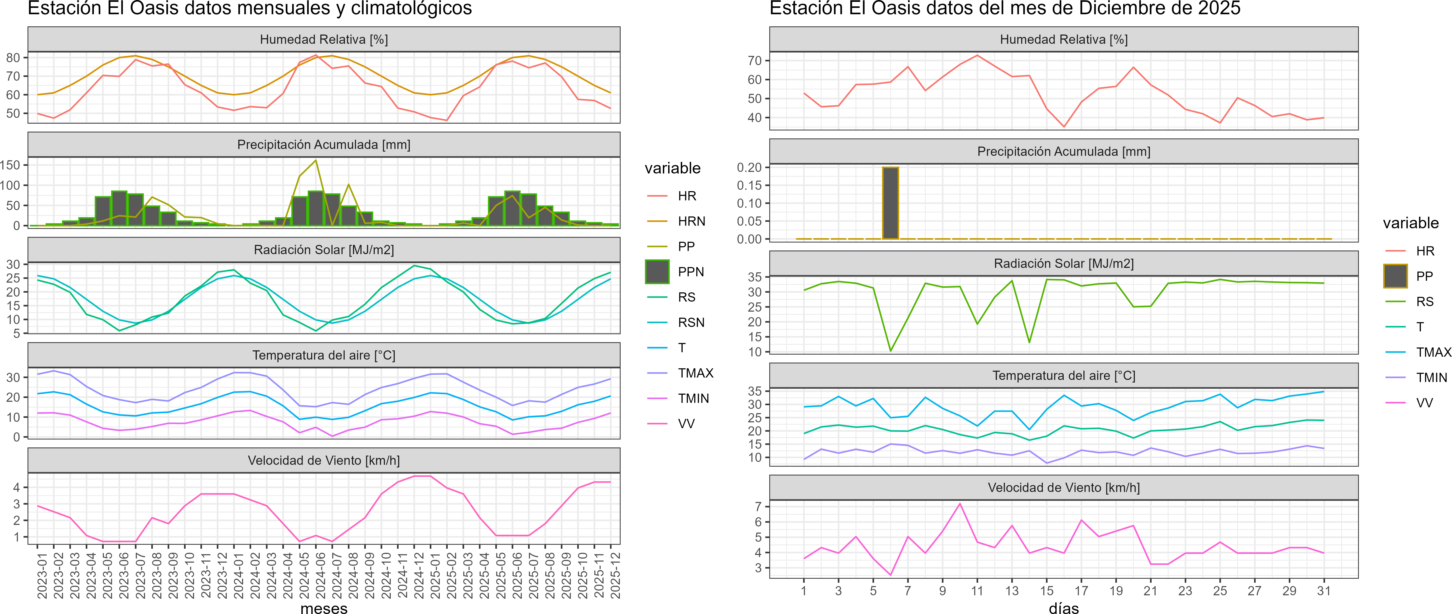 La estación El Oasis corresponde al distrito agroclimático 13-2. Para este distrito climático la temperatura mínima, media y máxima climatológicas alcanzan los 10.6°C, 20.4°C y 30.2°C respectivamente. Por su parte, respecto a las temperaturas medidas durante el mes de diciembre en la estación: la temperatura mínima alcanzo los 12.1°C (1.5°C sobre la climatológica), la temperatura media 20.6°C (0.2°C sobre la climatológica) y la temperatura máxima llegó a los 29.2°C (-1°C bajo la climatológica).