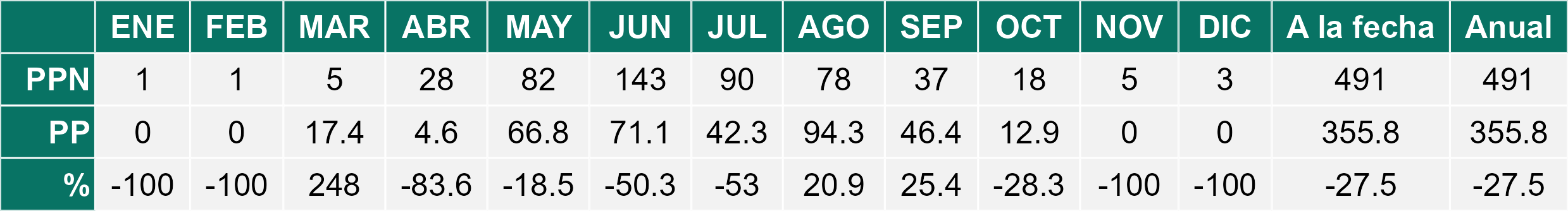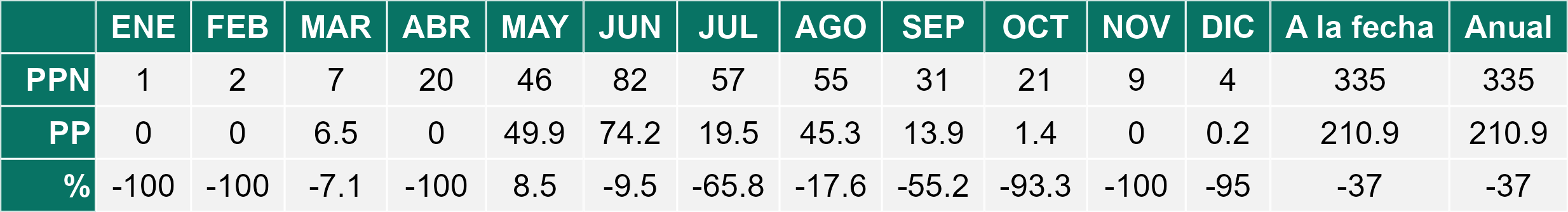 En el mes de diciembre se registró una pluviometría de 0 mm, lo cual representa un 0% con respecto al mismo mes de un año normal. De enero a diciembre se ha registrado un total acumulado de 355.8 mm, en circunstancias que un año normal registraría a la fecha 491 mm, lo que representa un déficit de 27.5%. A la misma fecha, durante el año 2024 la precipitación alcanzaba los 0 mm.