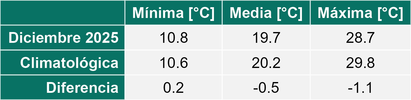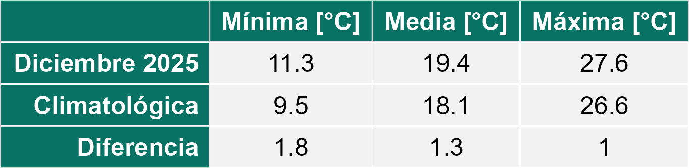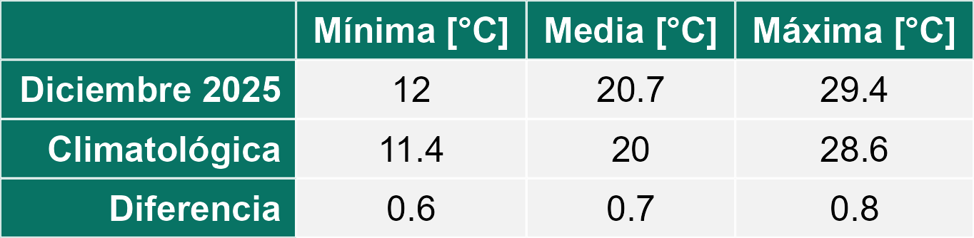 Diciembre se presentó con una condición de tiempo seco marcando el inicio del verano. Los registros indican un ascenso marcado en las temperaturas máximas y mínimas medias en toda la Región.