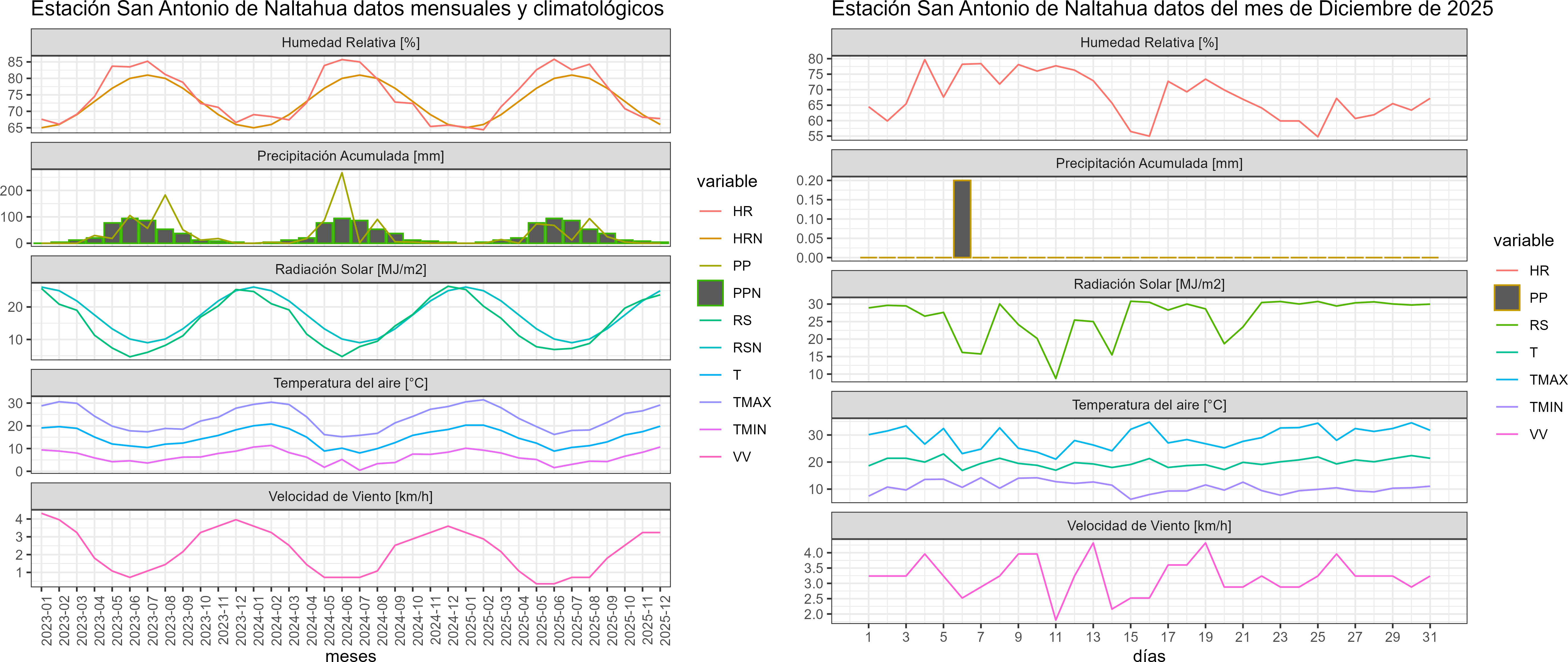 La estación San Antonio de Naltahua corresponde al distrito agroclimático 13-1. Para este distrito climático la temperatura mínima, media y máxima climatológicas alcanzan los 10°C, 20°C y 30°C respectivamente. Por su parte, respecto a las temperaturas medidas durante el mes de diciembre en la estación: la temperatura mínima alcanzo los 10.7°C (0.7°C sobre la climatológica), la temperatura media 19.8°C (-0.2°C bajo la climatológica) y la temperatura máxima llegó a los 29.2°C (-0.8°C bajo la climatológica).