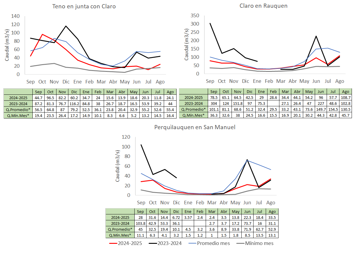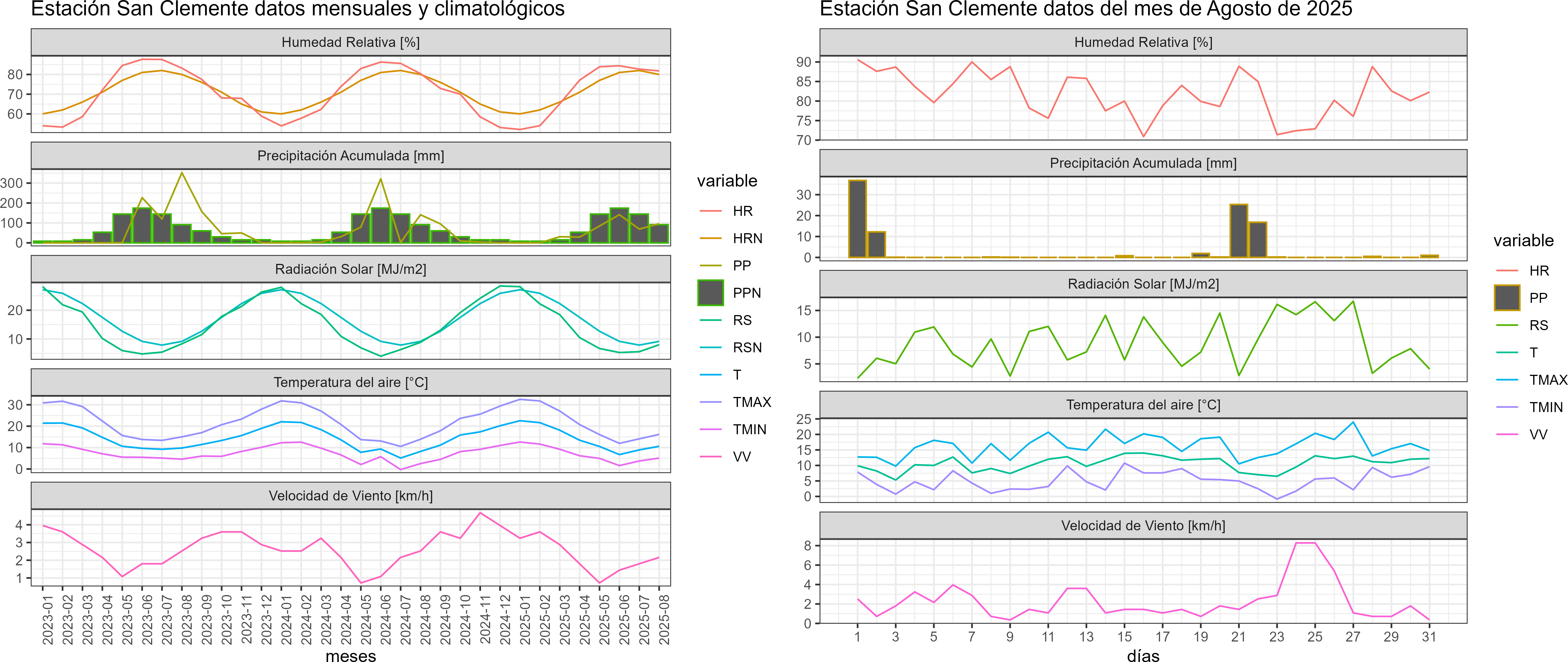 La estación San Clemente corresponde al distrito agroclimático 6-7-4. Para este distrito climático la temperatura mínima, media y máxima climatológicas alcanzan los 3.6°C, 9.6°C y 15.6°C respectivamente. Por su parte, respecto a las temperaturas medidas durante el mes de agosto en la estación: la temperatura mínima alcanzo los 5.1°C (1.5°C sobre la climatológica), la temperatura media 10.6°C (1°C sobre la climatológica) y la temperatura máxima llegó a los 16.2°C (0.6°C sobre la climatológica). En el mes de agosto se registró una pluviometría de 96.1 mm, lo cual representa un 81.4% con respecto al mismo mes de un año normal. De enero a agosto se ha registrado un total acumulado de 450.5 mm, en circunstancias que un año normal registraría a la fecha 660 mm, lo que representa un déficit de 31.7%. A la misma fecha, durante el año 2024 la precipitación alcanzaba los 141 mm.