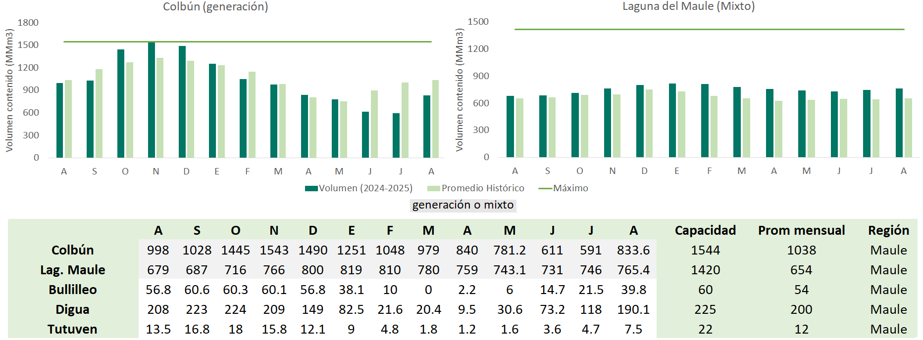 Los embalses por su parte, si bien aún tienen agua, están decayendo rápidamente por debajo de las medias históricas, aunque los embalses cordilleranos (la laguna del Maule en el caso de la región, que es muy importantes por su alto volumen de almacenamiento) están con valores mayores a la media histórica gracias a las lluvias importantes de los años anteriores y al derretimiento de la nieve explicado en el punto anterior