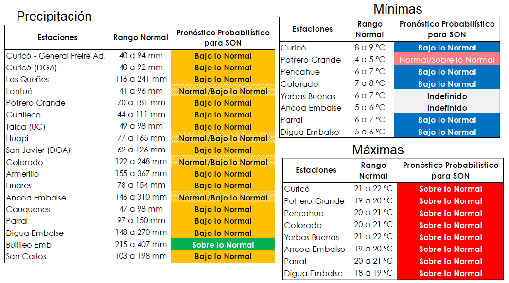 El pronóstico de temporada de la Dirección Meteorológica de Chile proyecta precipitaciones menores a lo normal, aunque en toda la zona centro sur las proyecciones indican precipitaciones en torno a lo normal, lo que consolidaría año con déficit de precipitaciones, aunque esto aún no se manifiesta en un deterioro notorio de la condición de la vegetación.