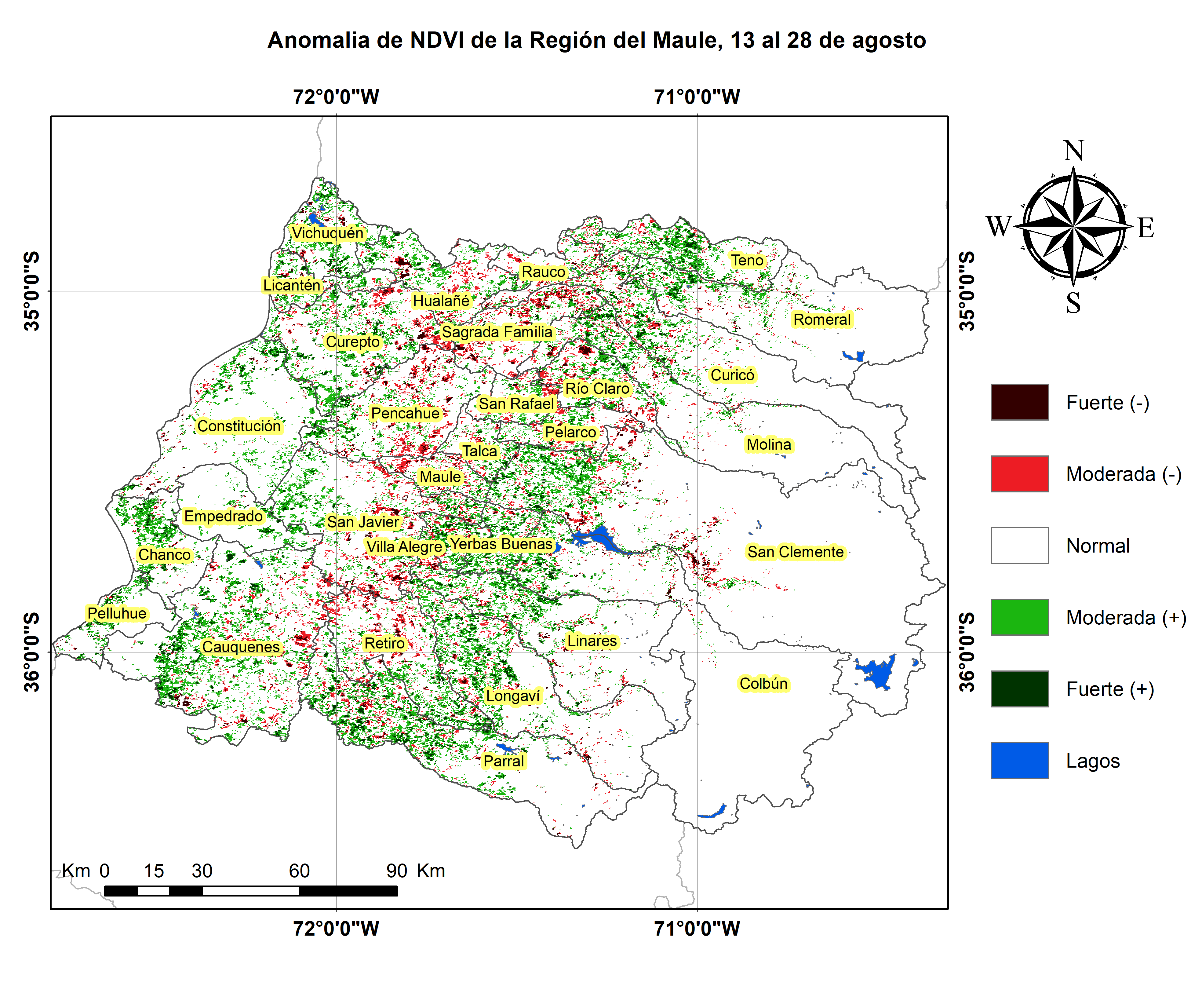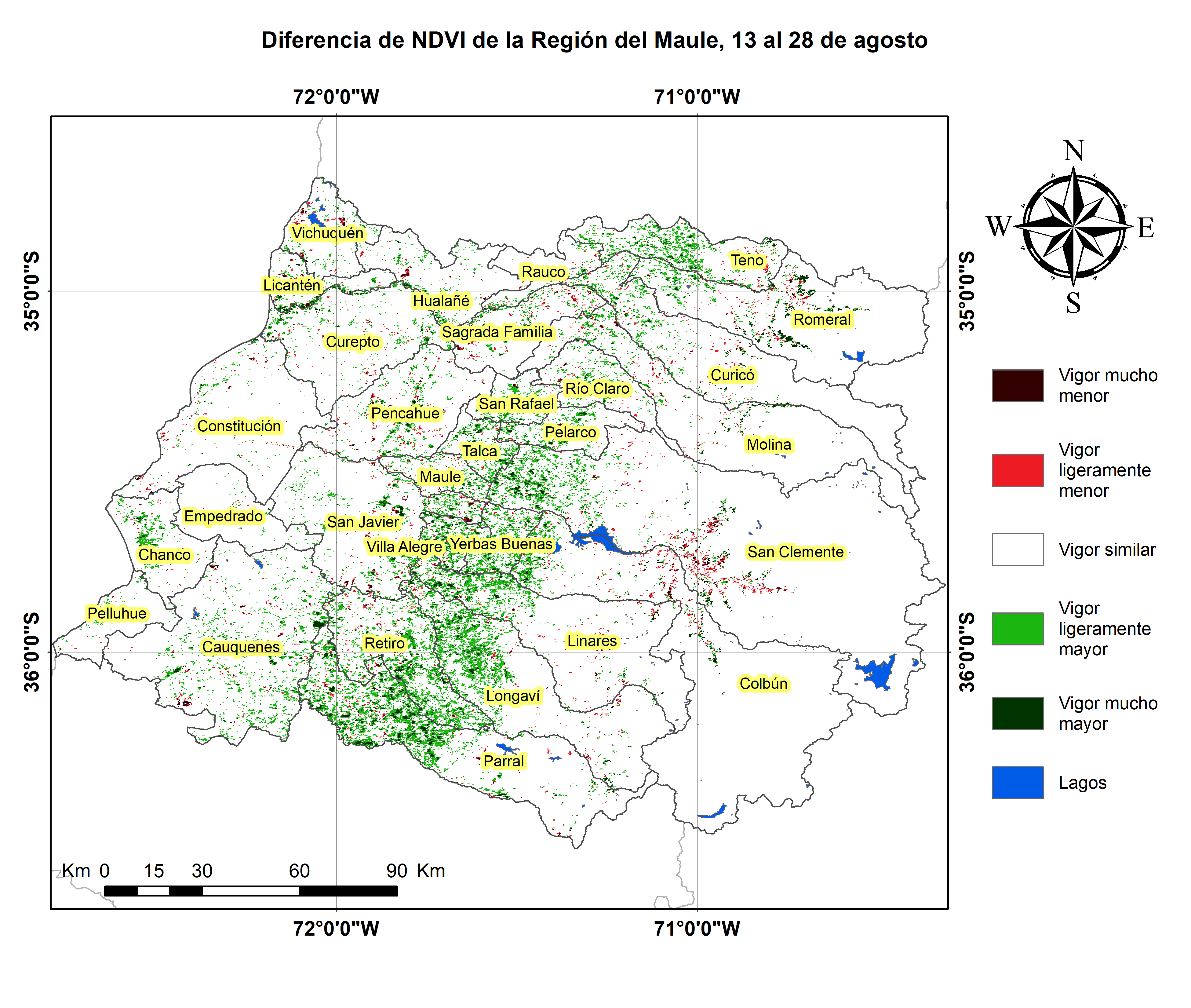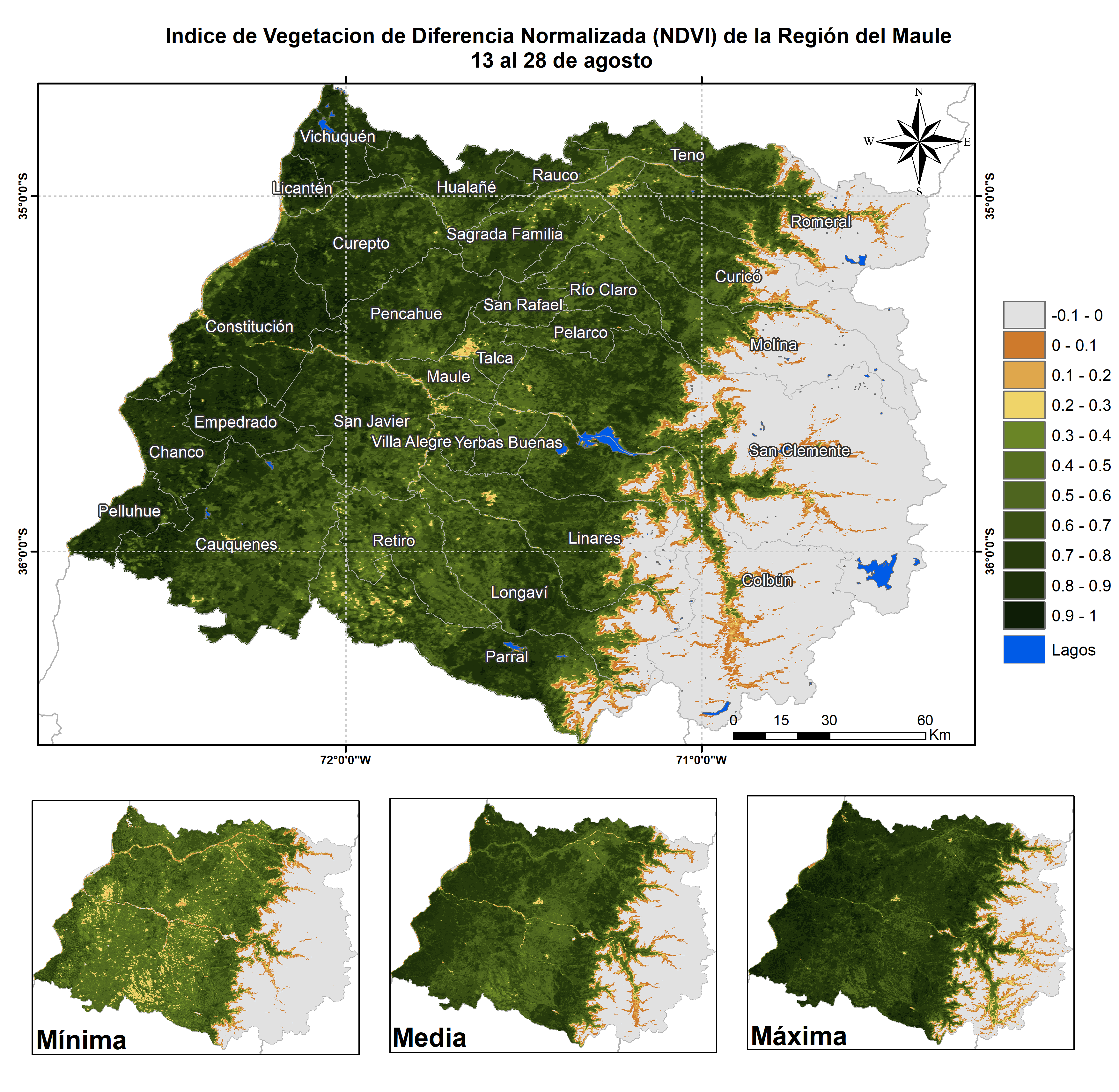 Respecto de la respuesta fisiológica de las plantas al efecto del clima, las imágenes satelitales reflejan la magnitud del crecimiento o disminución de la cobertura vegetal en esta época del año mediante el índice de vegetación NDVI (Desviación Normalizada del Índice de Vegetación).