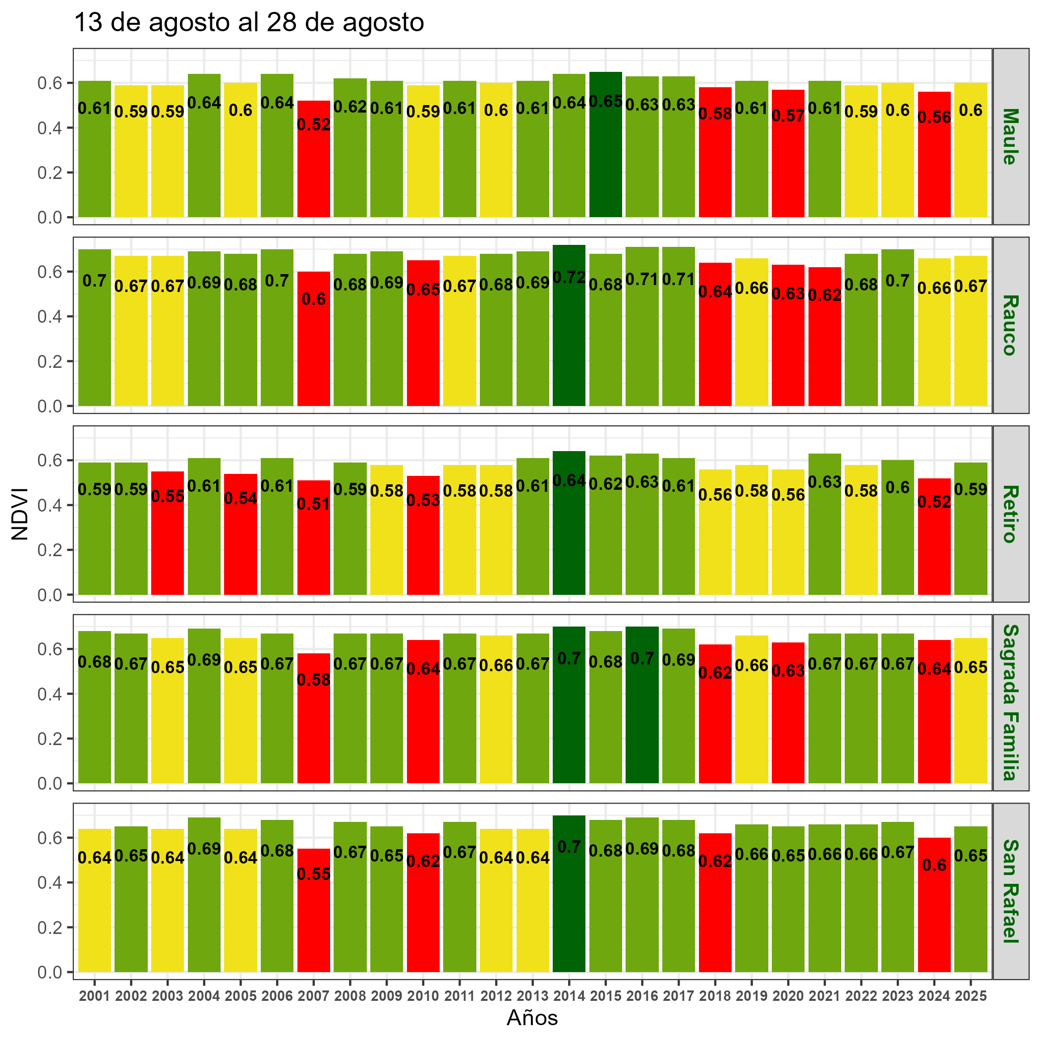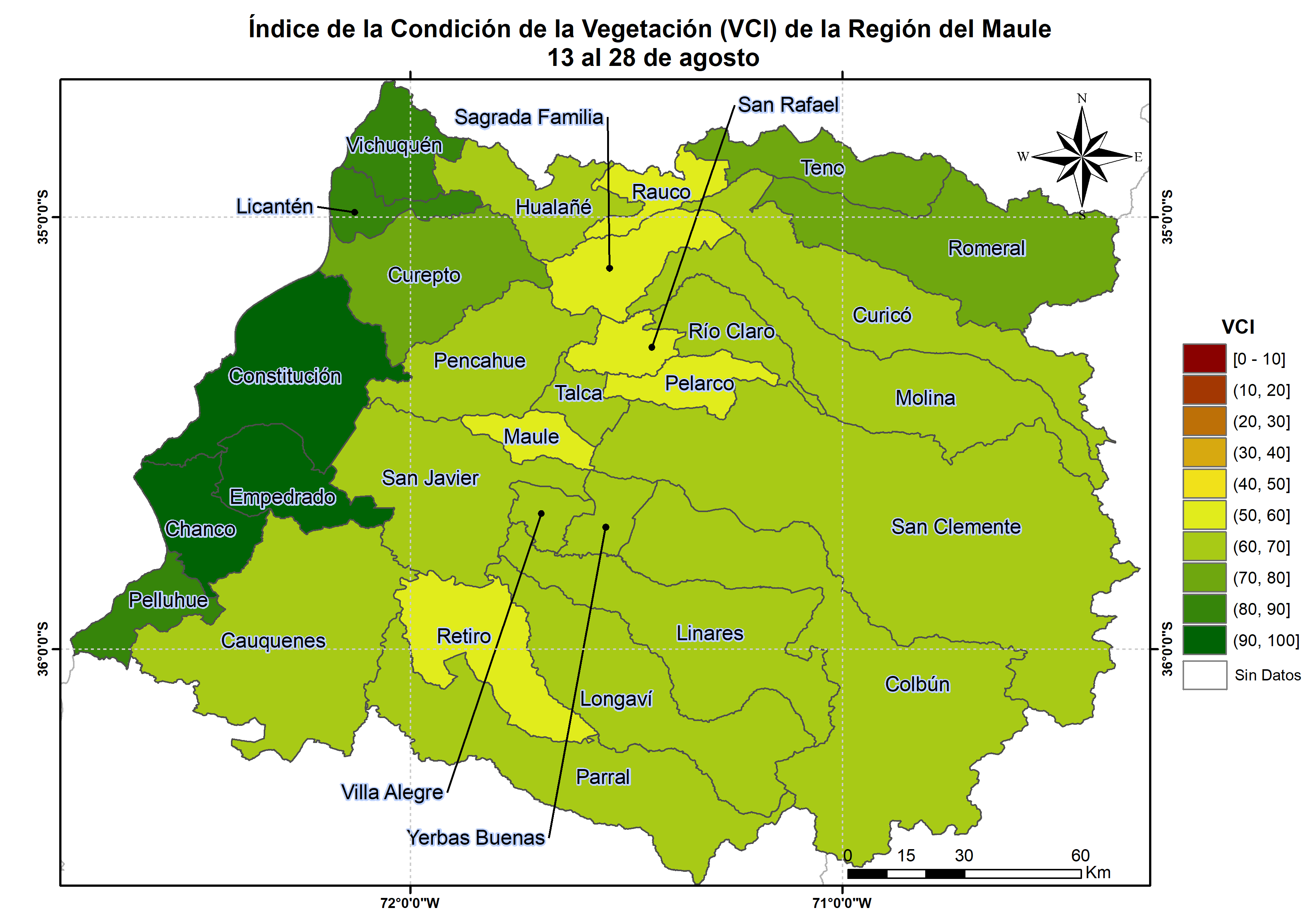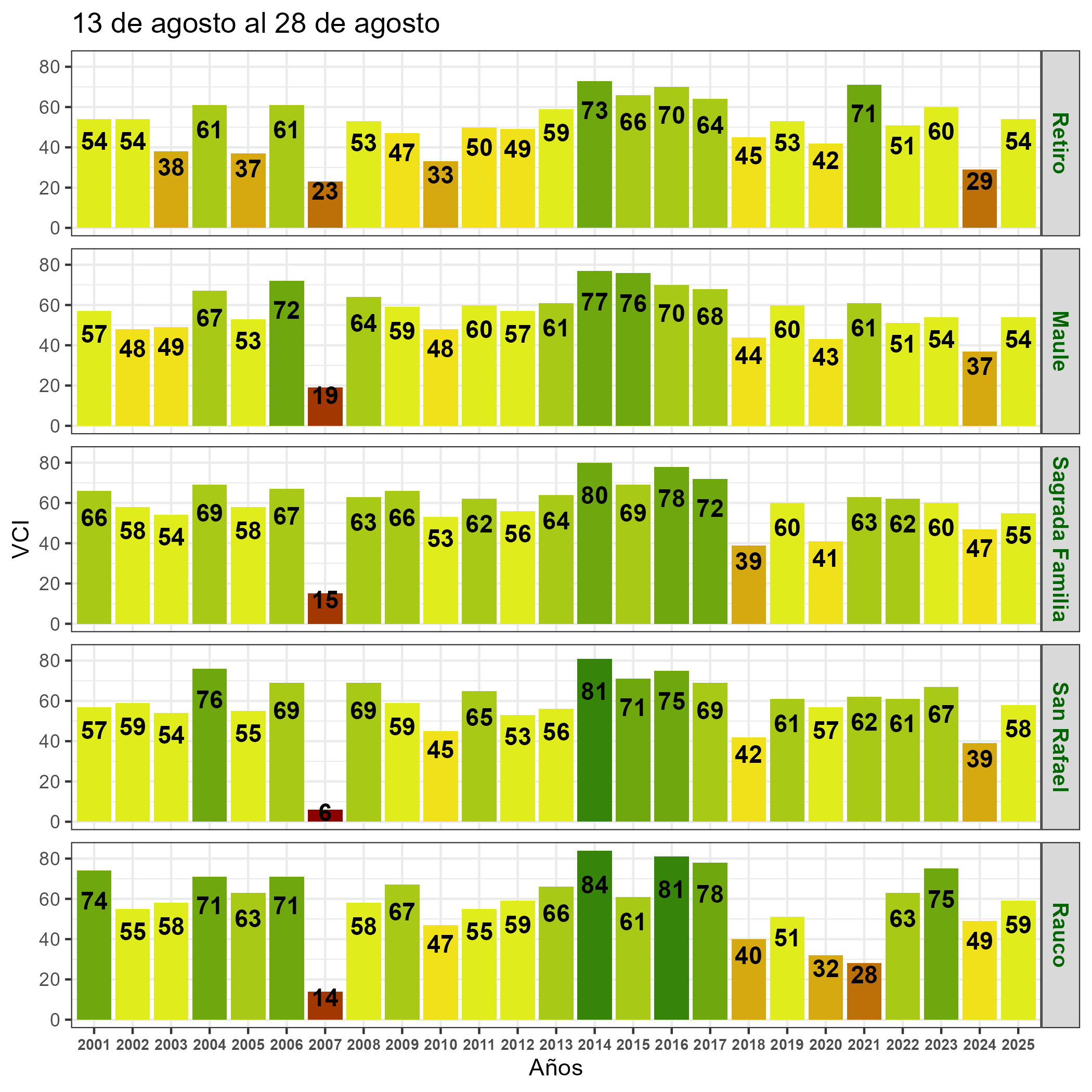 En términos globales la Región presentó un valor mediano de VCI de 68% para el período comprendido desde el 13 al 28 de agosto. A igual período del año pasado presentaba un VCI de 48% (Fig. 1). De acuerdo a la Tabla 1 la Región del Maule, en términos globales presenta una condición Favorable.
