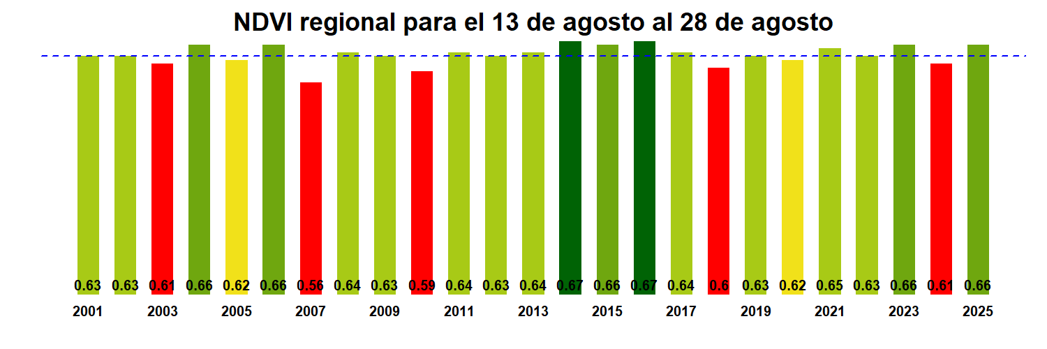 Para esta quincena se observa un NDVI promedio regional de 0.66 mientras el año pasado había sido de 0.61. El valor promedio histórico para esta región, en este período del año es de 0.63.