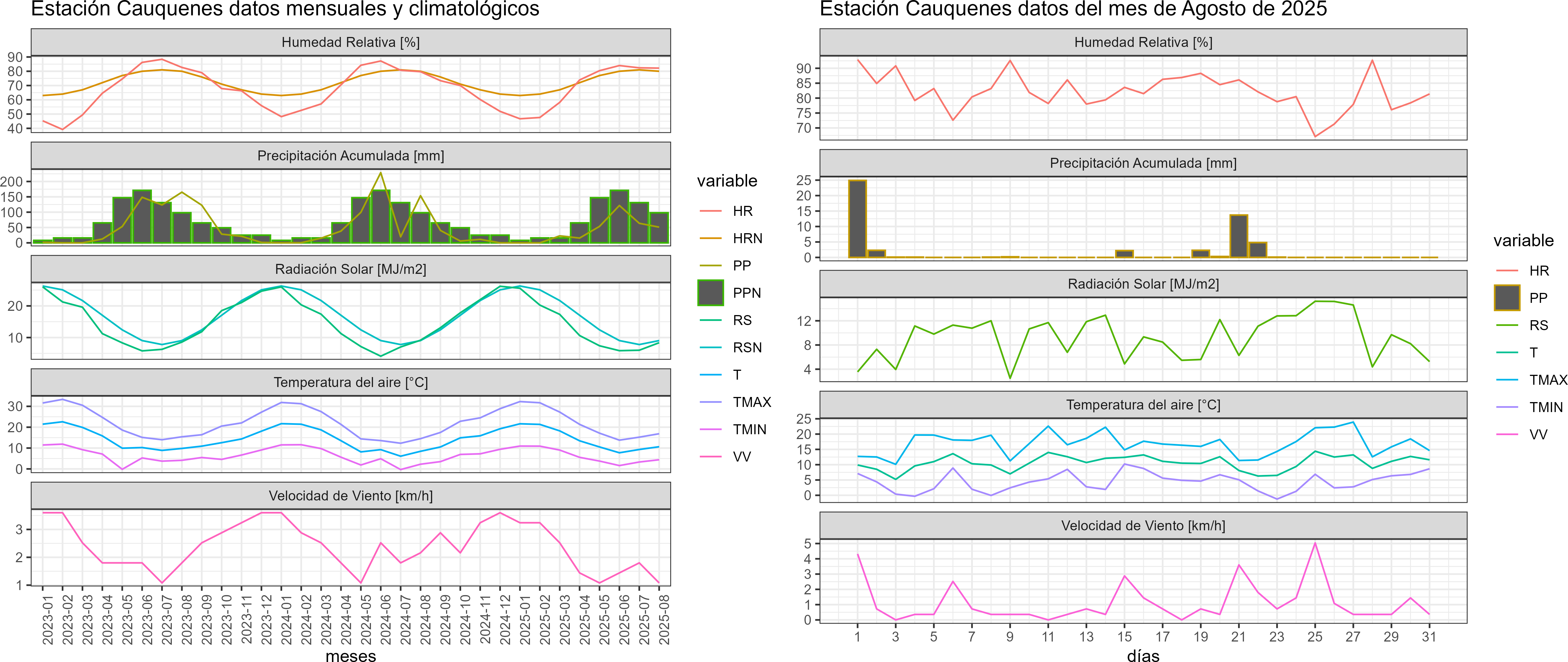 La estación Cauquenes corresponde al distrito agroclimático 7-8-3. Para este distrito climático la temperatura mínima, media y máxima climatológicas alcanzan los 3.6°C, 9.5°C y 15.3°C respectivamente. Por su parte, respecto a las temperaturas medidas durante el mes de agosto en la estación: la temperatura mínima alcanzo los 4.4°C (0.8°C sobre la climatológica), la temperatura media 10.6°C (1.1°C sobre la climatológica) y la temperatura máxima llegó a los 16.9°C (1.6°C sobre la climatológica). En el mes de agosto se registró una pluviometría de 51.1 mm, lo cual representa un 49.6% con respecto al mismo mes de un año normal. De enero a agosto se ha registrado un total acumulado de 328.4 mm, en circunstancias que un año normal registraría a la fecha 611 mm, lo que representa un déficit de 46.3%. A la misma fecha, durante el año 2024 la precipitación alcanzaba los 153.6 mm.