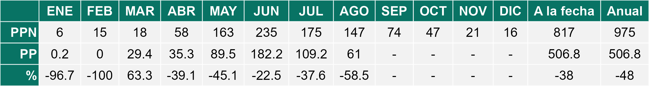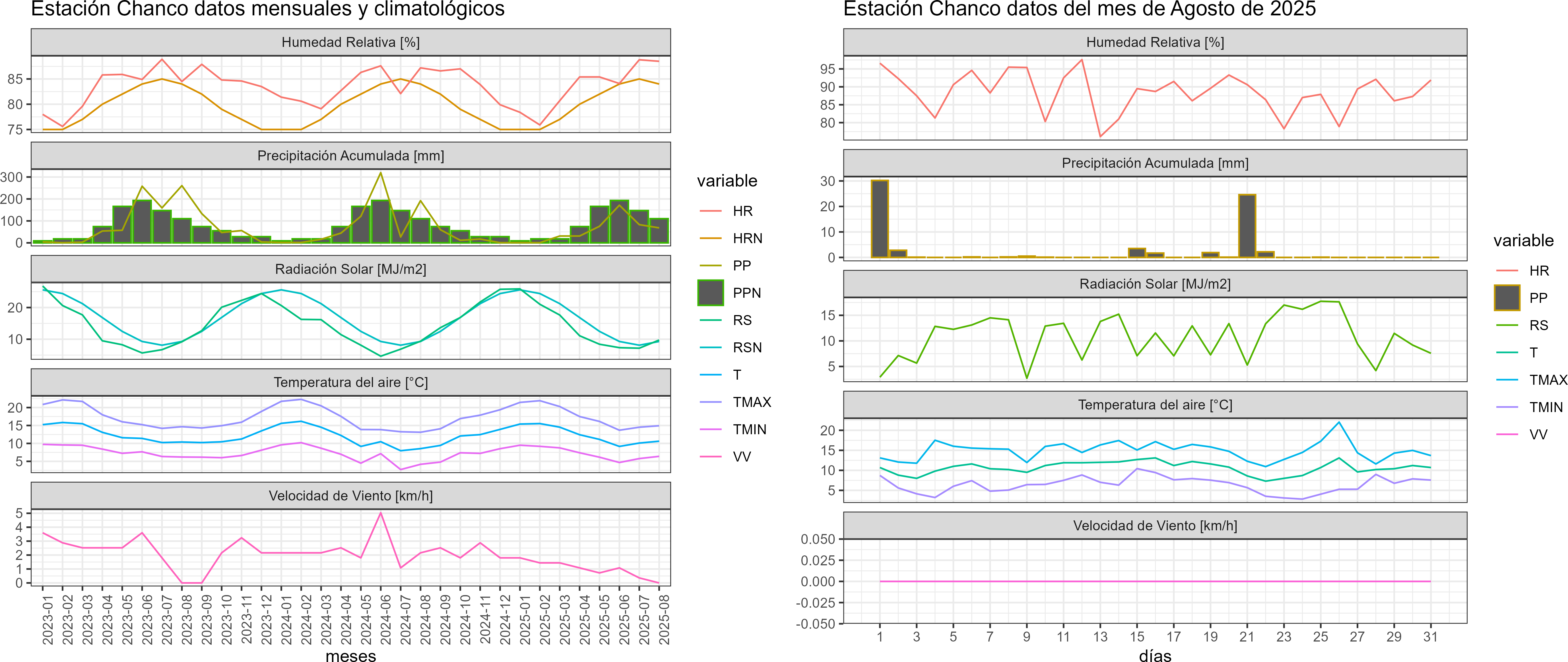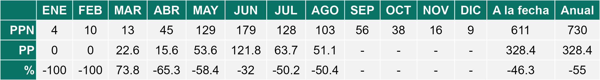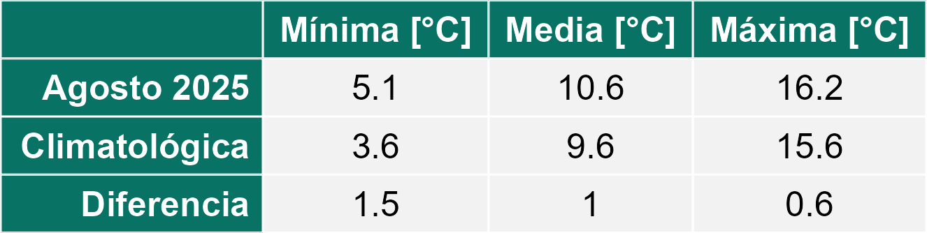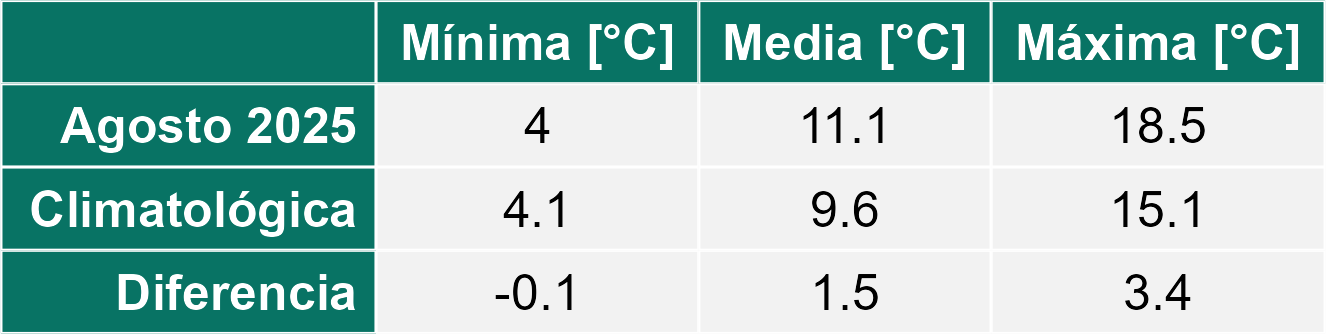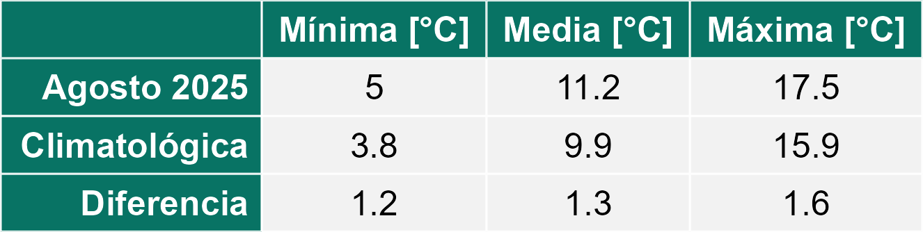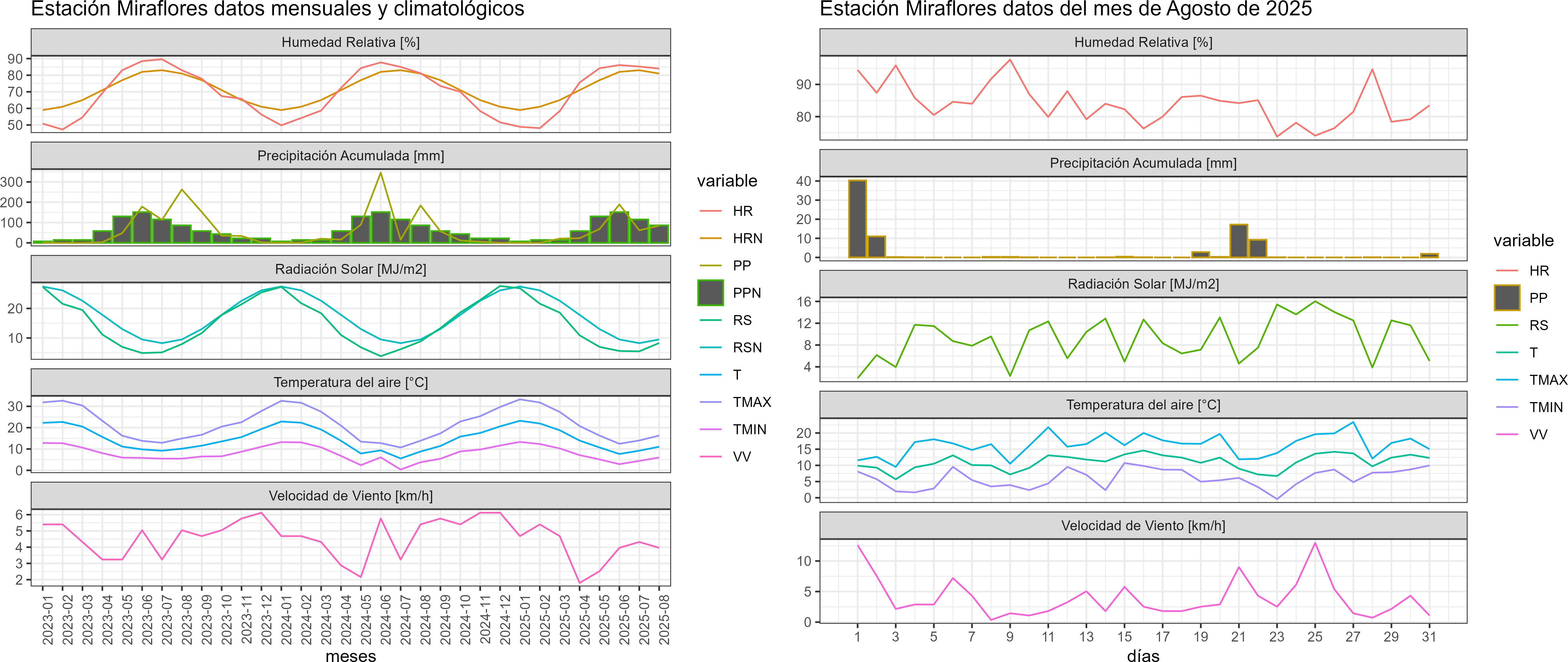 La estación Miraflores corresponde al distrito agroclimático 7-8-4. Para este distrito climático la temperatura mínima, media y máxima climatológicas alcanzan los 4.2°C, 10°C y 15.8°C respectivamente. Por su parte, respecto a las temperaturas medidas durante el mes de agosto en la estación: la temperatura mínima alcanzo los 6°C (1.8°C sobre la climatológica), la temperatura media 11.1°C (1.1°C sobre la climatológica) y la temperatura máxima llegó a los 16.3°C (0.5°C sobre la climatológica). En el mes de agosto se registró una pluviometría de 84.5 mm, lo cual representa un 76.1% con respecto al mismo mes de un año normal. De enero a agosto se ha registrado un total acumulado de 446.5 mm, en circunstancias que un año normal registraría a la fecha 648 mm, lo que representa un déficit de 31.1%. A la misma fecha, durante el año 2024 la precipitación alcanzaba los 184 mm.