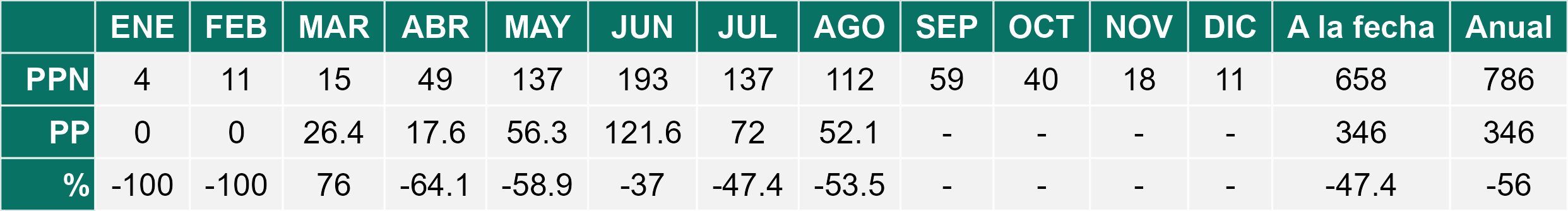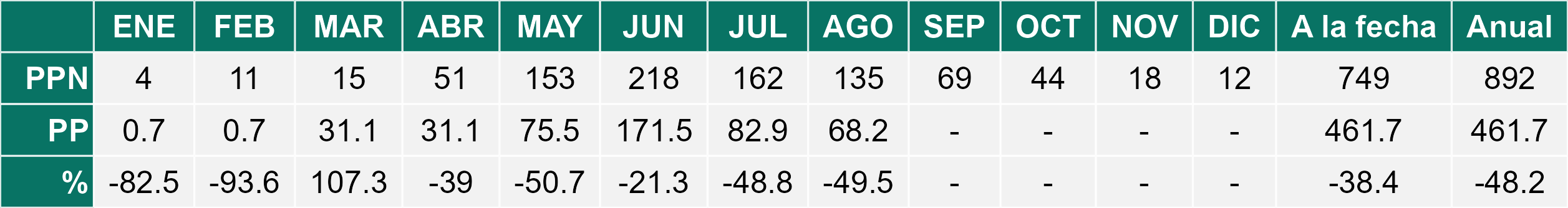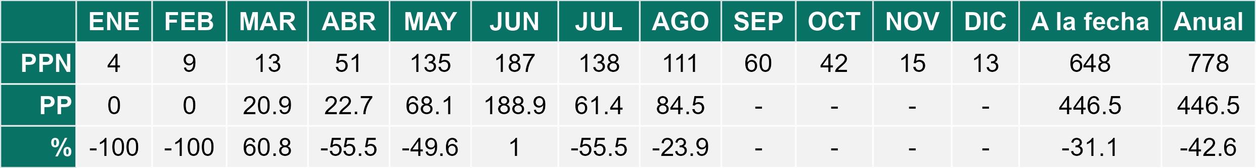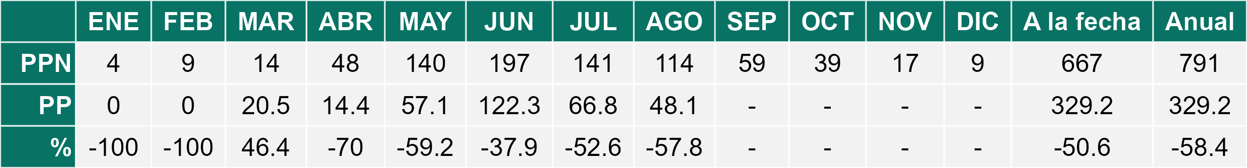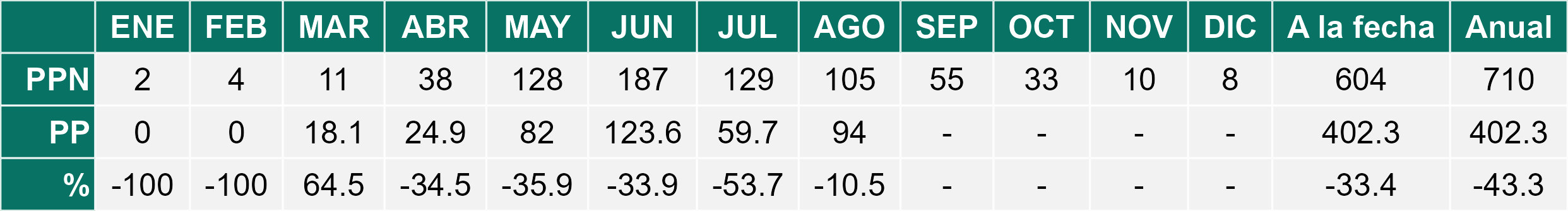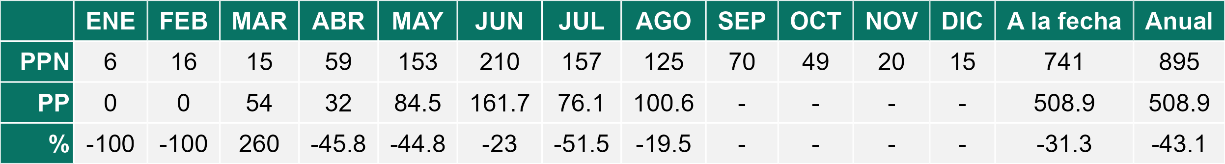 La estación Miraflores corresponde al distrito agroclimático 7-8-4. Para este distrito climático la temperatura mínima, media y máxima climatológicas alcanzan los 4.2°C, 10°C y 15.8°C respectivamente. Por su parte, respecto a las temperaturas medidas durante el mes de agosto en la estación: la temperatura mínima alcanzo los 6°C (1.8°C sobre la climatológica), la temperatura media 11.1°C (1.1°C sobre la climatológica) y la temperatura máxima llegó a los 16.3°C (0.5°C sobre la climatológica). En el mes de agosto se registró una pluviometría de 84.5 mm, lo cual representa un 76.1% con respecto al mismo mes de un año normal. De enero a agosto se ha registrado un total acumulado de 446.5 mm, en circunstancias que un año normal registraría a la fecha 648 mm, lo que representa un déficit de 31.1%. A la misma fecha, durante el año 2024 la precipitación alcanzaba los 184 mm.