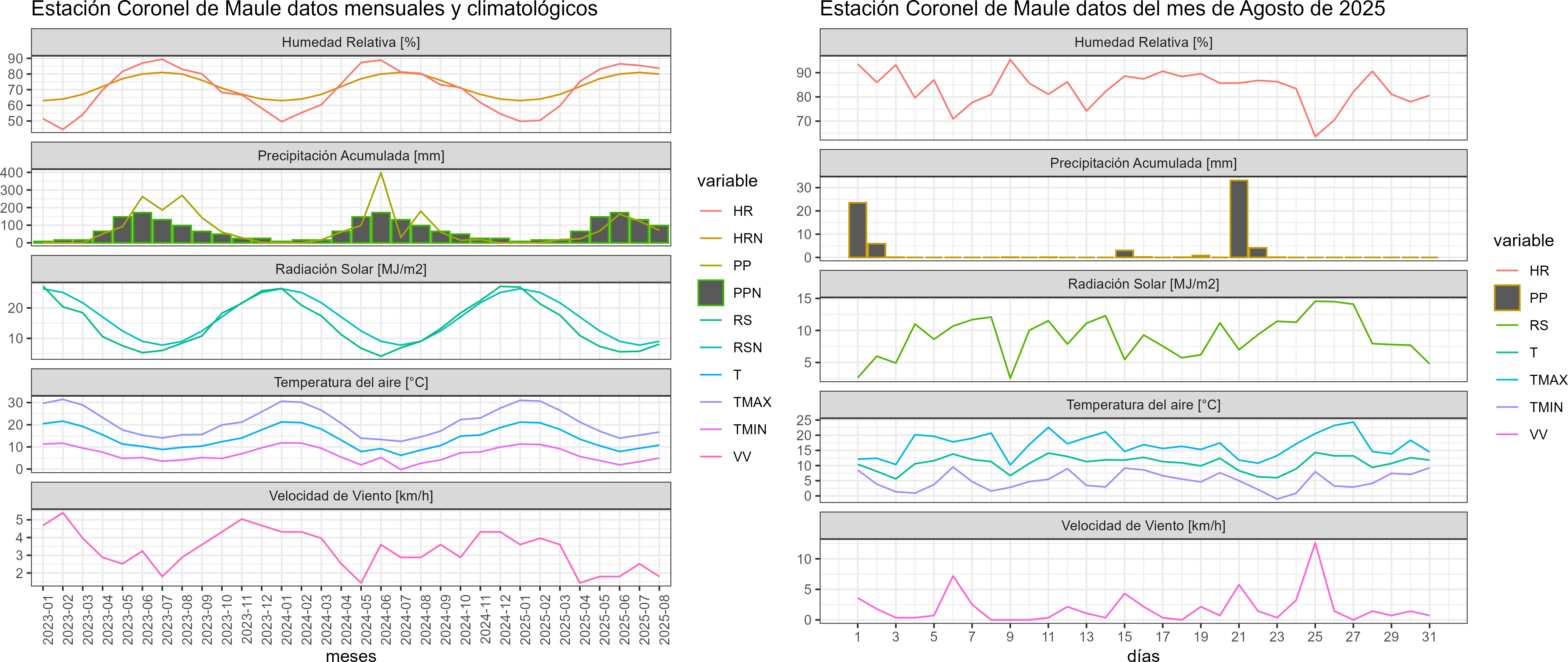 La estación Coronel de Maule corresponde al distrito agroclimático 7-8-3. Para este distrito climático la temperatura mínima, media y máxima climatológicas alcanzan los 4.4°C, 9.6°C y 14.8°C respectivamente. Por su parte, respecto a las temperaturas medidas durante el mes de agosto en la estación: la temperatura mínima alcanzo los 5°C (0.6°C sobre la climatológica), la temperatura media 10.8°C (1.2°C sobre la climatológica) y la temperatura máxima llegó a los 16.7°C (1.9°C sobre la climatológica). En el mes de agosto se registró una pluviometría de 71.1 mm, lo cual representa un 53.9% con respecto al mismo mes de un año normal. De enero a agosto se ha registrado un total acumulado de 465 mm, en circunstancias que un año normal registraría a la fecha 759 mm, lo que representa un déficit de 38.7%. A la misma fecha, durante el año 2024 la precipitación alcanzaba los 179.4 mm.