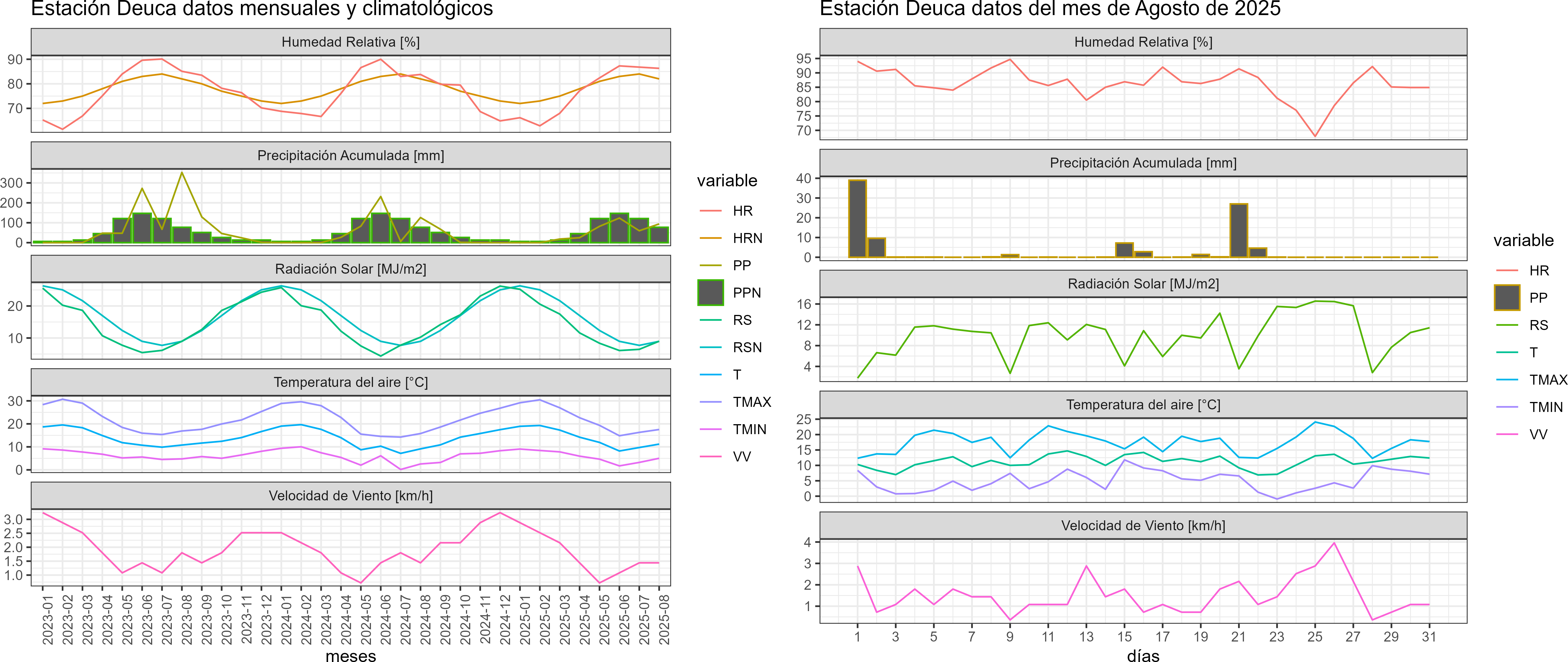 La estación Deuca corresponde al distrito agroclimático 6-7-1. Para este distrito climático la temperatura mínima, media y máxima climatológicas alcanzan los 3.8°C, 9.9°C y 15.9°C respectivamente. Por su parte, respecto a las temperaturas medidas durante el mes de agosto en la estación: la temperatura mínima alcanzo los 5°C (1.2°C sobre la climatológica), la temperatura media 11.2°C (1.3°C sobre la climatológica) y la temperatura máxima llegó a los 17.5°C (1.6°C sobre la climatológica). En el mes de agosto se registró una pluviometría de 94 mm, lo cual representa un 89.5% con respecto al mismo mes de un año normal. De enero a agosto se ha registrado un total acumulado de 402.3 mm, en circunstancias que un año normal registraría a la fecha 604 mm, lo que representa un déficit de 33.4%. A la misma fecha, durante el año 2024 la precipitación alcanzaba los 126.1 mm.