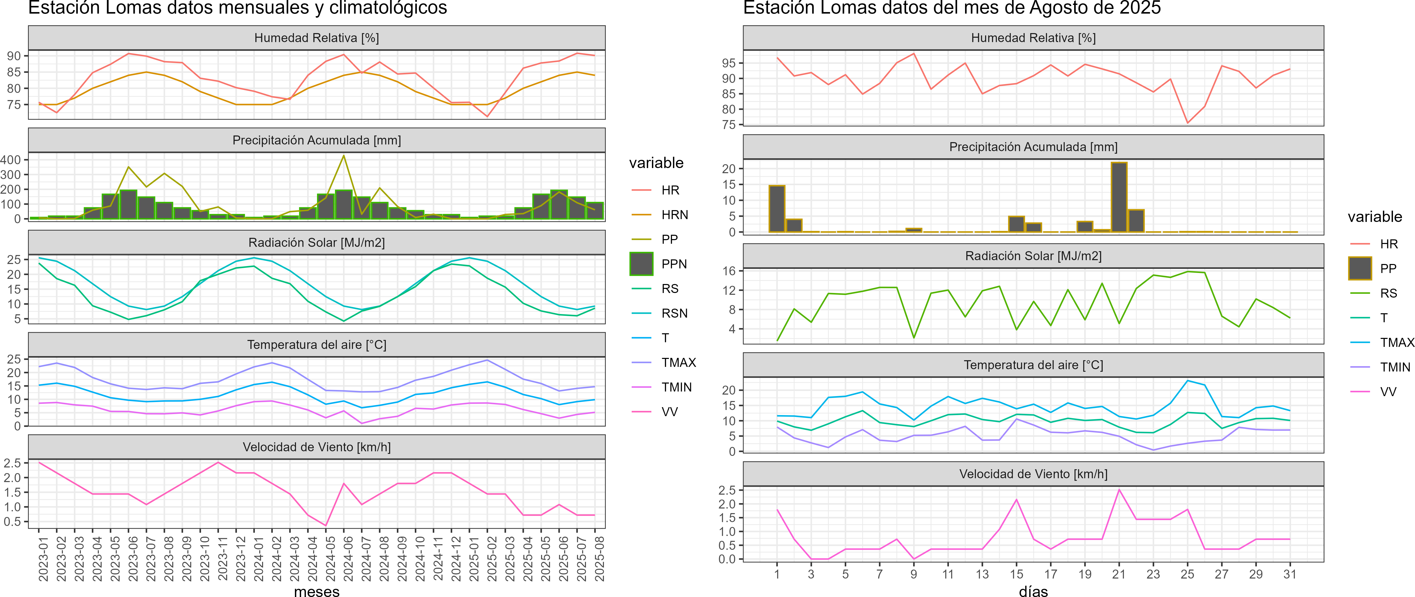 La estación Lomas corresponde al distrito agroclimático 7-8-1. Para este distrito climático la temperatura mínima, media y máxima climatológicas alcanzan los 5.3°C, 9.8°C y 14.3°C respectivamente. Por su parte, respecto a las temperaturas medidas durante el mes de agosto en la estación: la temperatura mínima alcanzo los 5.1°C (-0.2°C bajo la climatológica), la temperatura media 9.9°C (0.1°C sobre la climatológica) y la temperatura máxima llegó a los 14.7°C (0.4°C sobre la climatológica). En el mes de agosto se registró una pluviometría de 61 mm, lo cual representa un 41.5% con respecto al mismo mes de un año normal. De enero a agosto se ha registrado un total acumulado de 506.8 mm, en circunstancias que un año normal registraría a la fecha 817 mm, lo que representa un déficit de 38%. A la misma fecha, durante el año 2024 la precipitación alcanzaba los 209.5 mm.