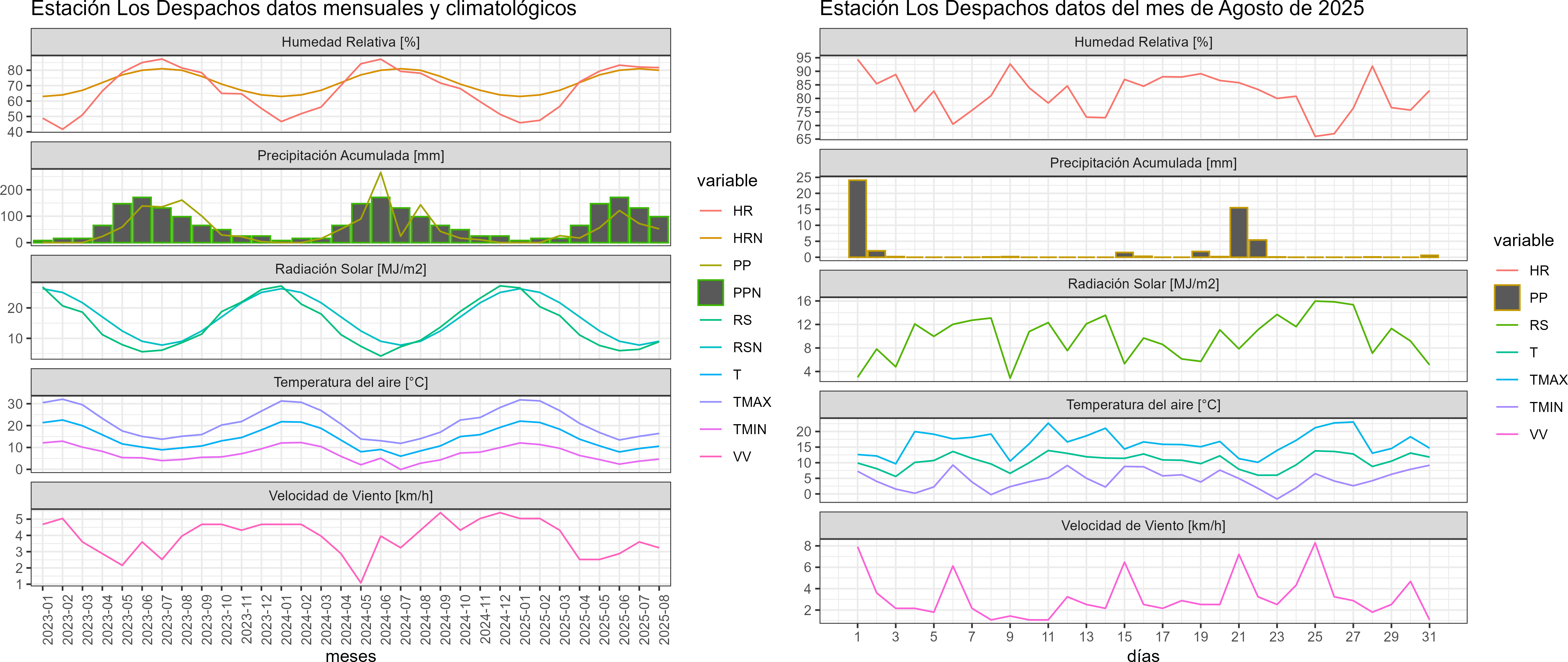La estación Los Despachos corresponde al distrito agroclimático 7-8-3. Para este distrito climático la temperatura mínima, media y máxima climatológicas alcanzan los 3.9°C, 9.4°C y 14.9°C respectivamente. Por su parte, respecto a las temperaturas medidas durante el mes de agosto en la estación: la temperatura mínima alcanzo los 4.7°C (0.8°C sobre la climatológica), la temperatura media 10.6°C (1.2°C sobre la climatológica) y la temperatura máxima llegó a los 16.4°C (1.5°C sobre la climatológica). En el mes de agosto se registró una pluviometría de 52.1 mm, lo cual representa un 46.5% con respecto al mismo mes de un año normal. De enero a agosto se ha registrado un total acumulado de 346 mm, en circunstancias que un año normal registraría a la fecha 658 mm, lo que representa un déficit de 47.4%. A la misma fecha, durante el año 2024 la precipitación alcanzaba los 143.1 mm.