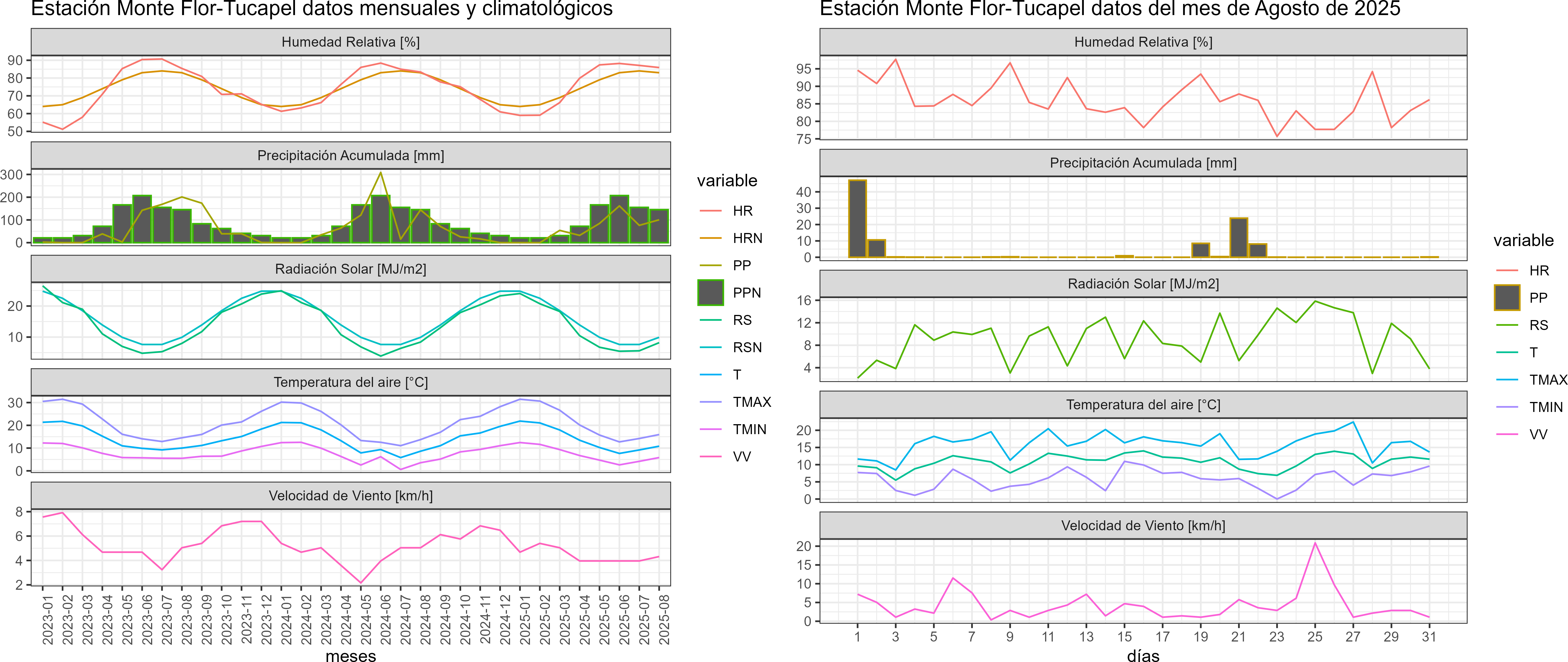 La estación Monte Flor-Tucapel corresponde al distrito agroclimático 7-9-1. Para este distrito climático la temperatura mínima, media y máxima climatológicas alcanzan los 4.1°C, 9.7°C y 15.3°C respectivamente. Por su parte, respecto a las temperaturas medidas durante el mes de agosto en la estación: la temperatura mínima alcanzo los 5.8°C (1.7°C sobre la climatológica), la temperatura media 10.8°C (1.1°C sobre la climatológica) y la temperatura máxima llegó a los 15.9°C (0.6°C sobre la climatológica). En el mes de agosto se registró una pluviometría de 100.6 mm, lo cual representa un 80.5% con respecto al mismo mes de un año normal. De enero a agosto se ha registrado un total acumulado de 508.9 mm, en circunstancias que un año normal registraría a la fecha 741 mm, lo que representa un déficit de 31.3%. A la misma fecha, durante el año 2024 la precipitación alcanzaba los 144.1 mm.