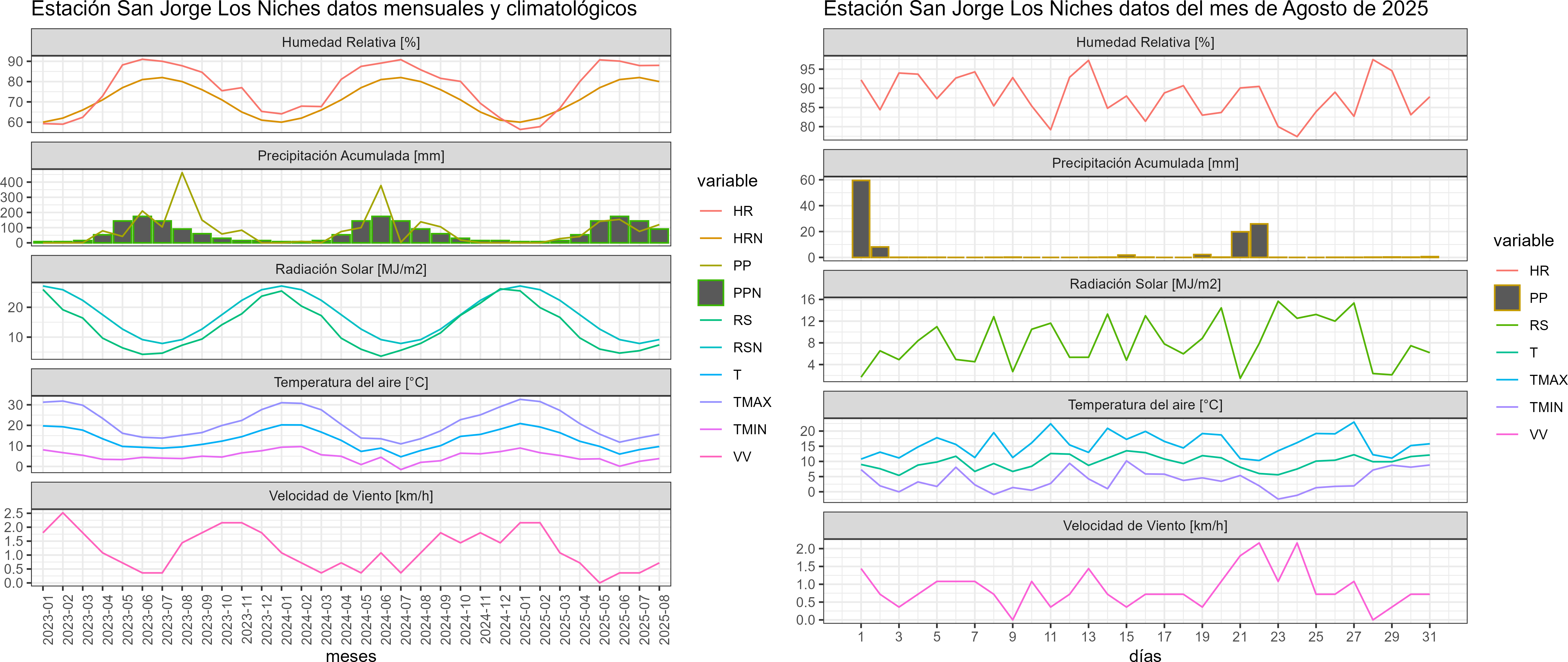 La estación San Jorge Los Niches corresponde al distrito agroclimático 6-7-4. Para este distrito climático la temperatura mínima, media y máxima climatológicas alcanzan los 3.4°C, 9.7°C y 15.9°C respectivamente. Por su parte, respecto a las temperaturas medidas durante el mes de agosto en la estación: la temperatura mínima alcanzo los 3.8°C (0.4°C sobre la climatológica), la temperatura media 9.7°C (Igual al valor climatológico) y la temperatura máxima llegó a los 15.7°C (-0.2°C bajo la climatológica). En el mes de agosto se registró una pluviometría de 120.2 mm, lo cual representa un 94.6% con respecto al mismo mes de un año normal. De enero a agosto se ha registrado un total acumulado de 560.6 mm, en circunstancias que un año normal registraría a la fecha 681 mm, lo que representa un déficit de 17.7%. A la misma fecha, durante el año 2024 la precipitación alcanzaba los 138.4 mm.