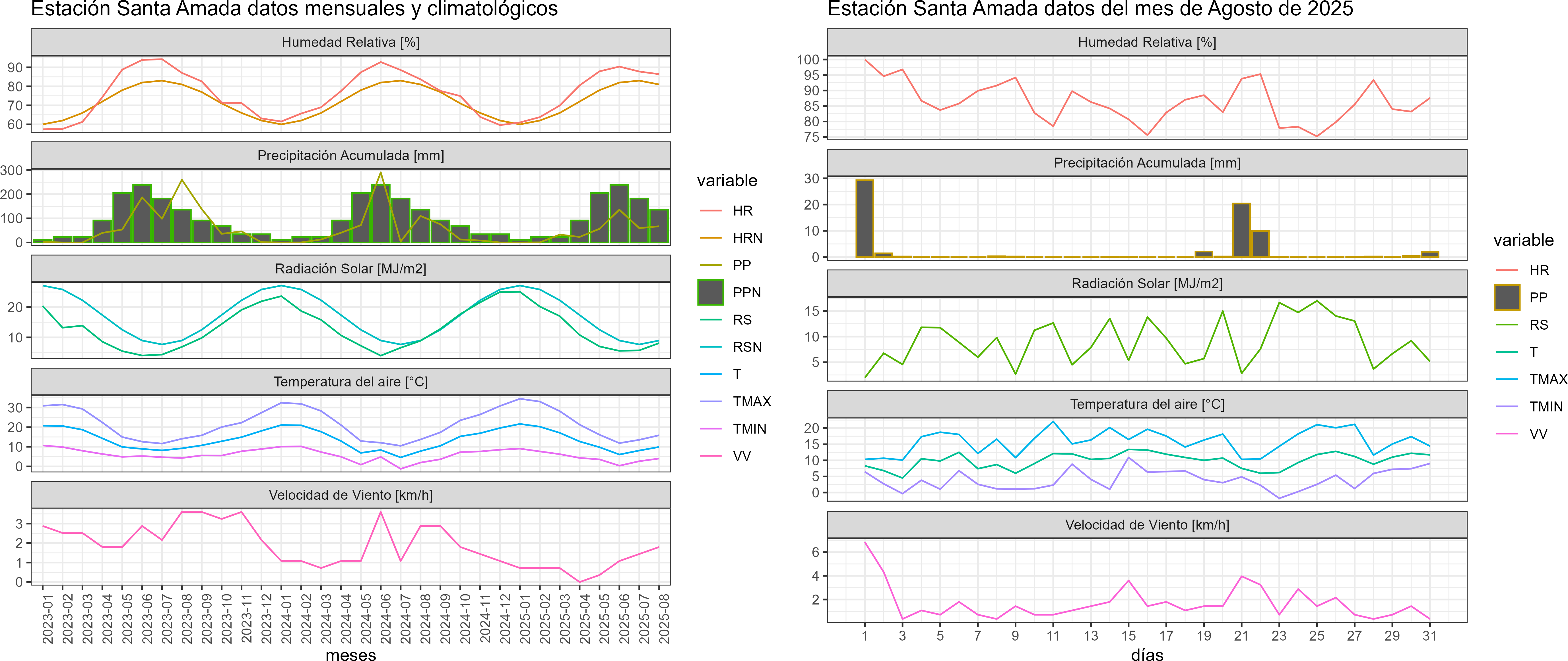 La estación Santa Amada corresponde al distrito agroclimático 7-8-5. Para este distrito climático la temperatura mínima, media y máxima climatológicas alcanzan los 3.5°C, 9.6°C y 15.6°C respectivamente. Por su parte, respecto a las temperaturas medidas durante el mes de agosto en la estación: la temperatura mínima alcanzo los 4°C (0.5°C sobre la climatológica), la temperatura media 9.9°C (0.3°C sobre la climatológica) y la temperatura máxima llegó a los 15.9°C (0.3°C sobre la climatológica). En el mes de agosto se registró una pluviometría de 67.1 mm, lo cual representa un 52.4% con respecto al mismo mes de un año normal. De enero a agosto se ha registrado un total acumulado de 374.9 mm, en circunstancias que un año normal registraría a la fecha 729 mm, lo que representa un déficit de 48.6%. A la misma fecha, durante el año 2024 la precipitación alcanzaba los 109.9 mm.