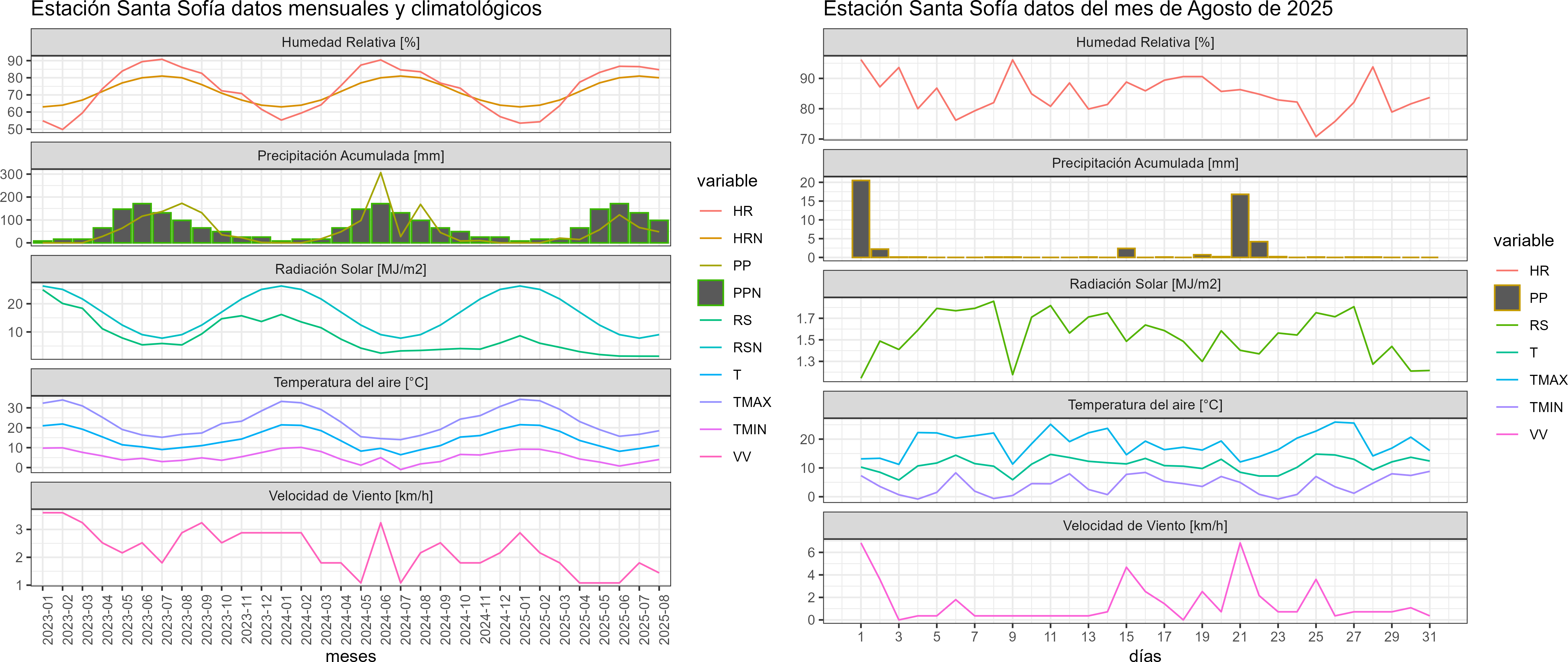 La estación Santa Sofía corresponde al distrito agroclimático 7-8-3. Para este distrito climático la temperatura mínima, media y máxima climatológicas alcanzan los 4.1°C, 9.6°C y 15.1°C respectivamente. Por su parte, respecto a las temperaturas medidas durante el mes de agosto en la estación: la temperatura mínima alcanzo los 4°C (-0.1°C bajo la climatológica), la temperatura media 11.1°C (1.5°C sobre la climatológica) y la temperatura máxima llegó a los 18.5°C (3.4°C sobre la climatológica). En el mes de agosto se registró una pluviometría de 48.1 mm, lo cual representa un 42.2% con respecto al mismo mes de un año normal. De enero a agosto se ha registrado un total acumulado de 329.2 mm, en circunstancias que un año normal registraría a la fecha 667 mm, lo que representa un déficit de 50.6%. A la misma fecha, durante el año 2024 la precipitación alcanzaba los 168 mm.