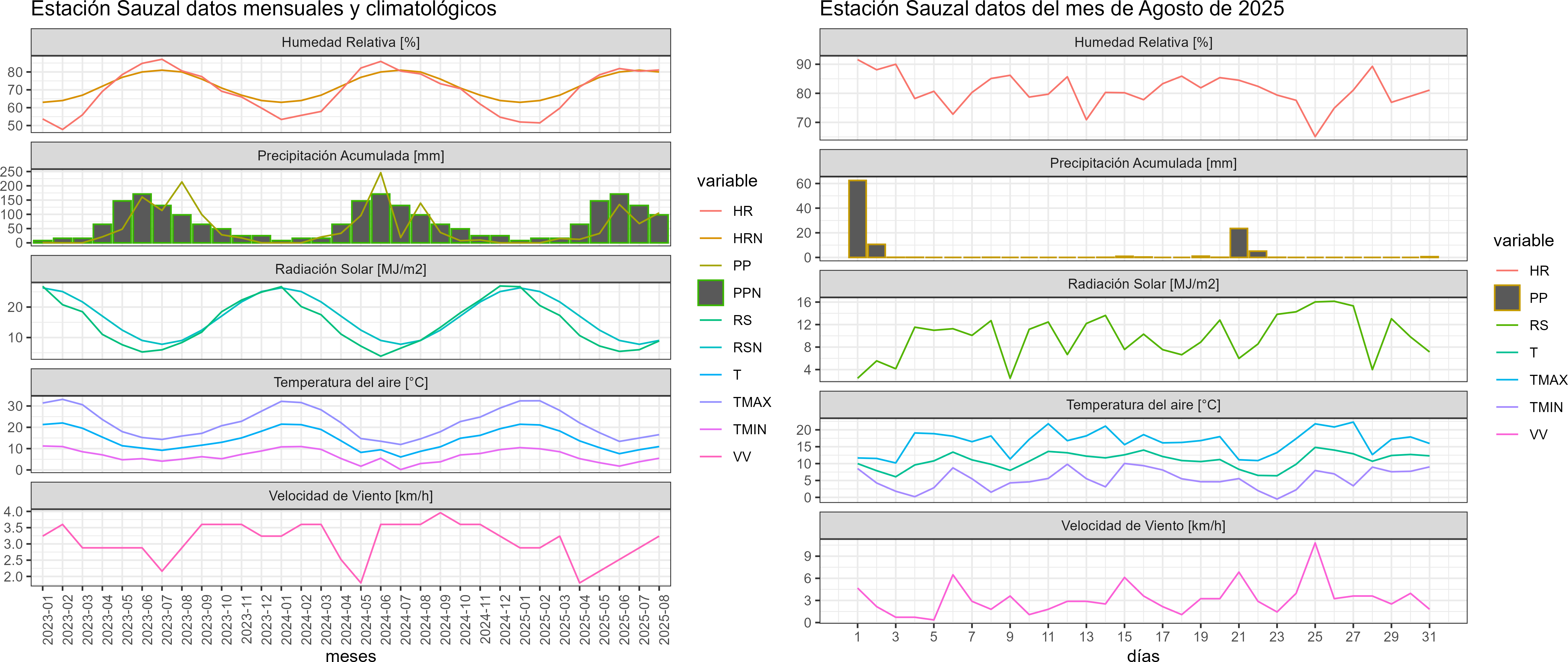 La estación Sauzal corresponde al distrito agroclimático 7-8-3. Para este distrito climático la temperatura mínima, media y máxima climatológicas alcanzan los 3.8°C, 9.5°C y 15.3°C respectivamente. Por su parte, respecto a las temperaturas medidas durante el mes de agosto en la estación: la temperatura mínima alcanzo los 5.5°C (1.7°C sobre la climatológica), la temperatura media 11°C (1.5°C sobre la climatológica) y la temperatura máxima llegó a los 16.6°C (1.3°C sobre la climatológica). En el mes de agosto se registró una pluviometría de 105.1 mm, lo cual representa un 110.6% con respecto al mismo mes de un año normal. De enero a agosto se ha registrado un total acumulado de 367.4 mm, en circunstancias que un año normal registraría a la fecha 565 mm, lo que representa un déficit de 35%. A la misma fecha, durante el año 2024 la precipitación alcanzaba los 139.1 mm.
