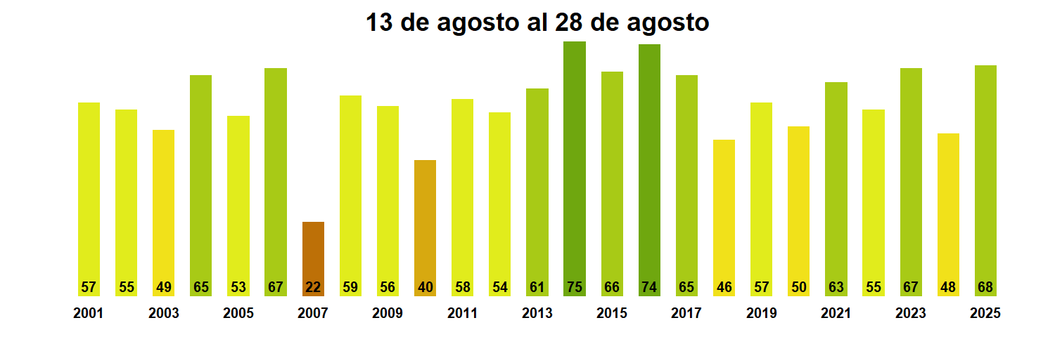 El año tiende rápidamente a una condición más seca de lo normal, con máximas más altas con alta probabilidad y mínimas más bajas con baja probabilidad. Pese a ello, esto no se ha manifestado en un decaimiento notorio en la condición de la vegetación, debido a que se viene saliendo de un invierno, si bien deficitario, con precipitaciones suficientes para sostener la vegetación, y porque agosto fue más cálido. Pese a ello, de cumplirse el pronóstico de la DMC, la condición de la vegetación podría decaer hacia el periodo estival. De la misma manera, la alta acumulación de frío en la parte inicial del invierno, sumada a las medias más altas en agosto podrían estar acelerando el desarrollo fenológico.