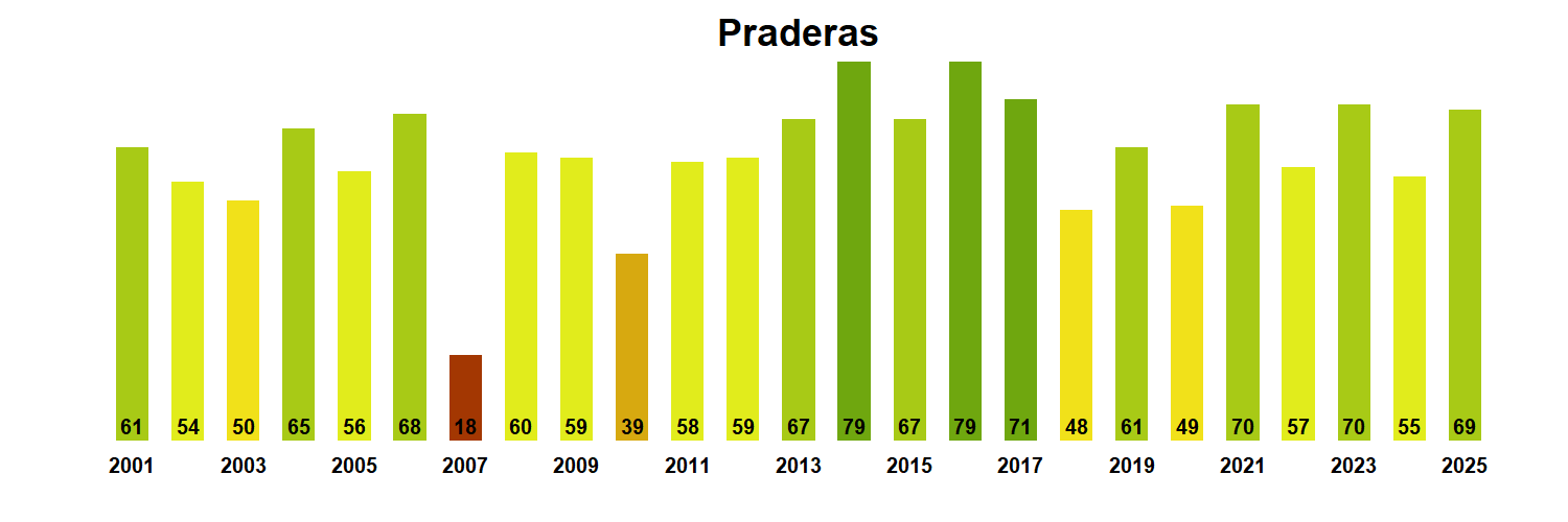 Praderas: El crecimiento de las praderas permite ir ajustando la carga animal para ser utilizadas como pastoreo directo, tener cuidado con la humedad del suelo por efecto del pisoteo y pérdidas de plantas por esta consecuencia. En secano interior utilizar las praderas (sembradas, naturales y/o suplementarias) como pastoreo con carga animal liviana.