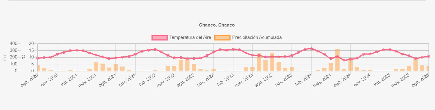 La estación Chanco corresponde al distrito agroclimático 7-8-1. Para este distrito climático la temperatura mínima, media y máxima climatológicas alcanzan los 4.7°C, 9.6°C y 14.5°C respectivamente. Por su parte, respecto a las temperaturas medidas durante el mes de agosto en la estación: la temperatura mínima alcanzo los 6.4°C (1.7°C sobre la climatológica), la temperatura media 10.6°C (1°C sobre la climatológica) y la temperatura máxima llegó a los 14.9°C (0.4°C sobre la climatológica). En el mes de agosto se registró una pluviometría de 68.2 mm, lo cual representa un 50.5% con respecto al mismo mes de un año normal. De enero a agosto se ha registrado un total acumulado de 461.7 mm, en circunstancias que un año normal registraría a la fecha 749 mm, lo que representa un déficit de 38.4%. A la misma fecha, durante el año 2024 la precipitación alcanzaba los 192.2 mm.