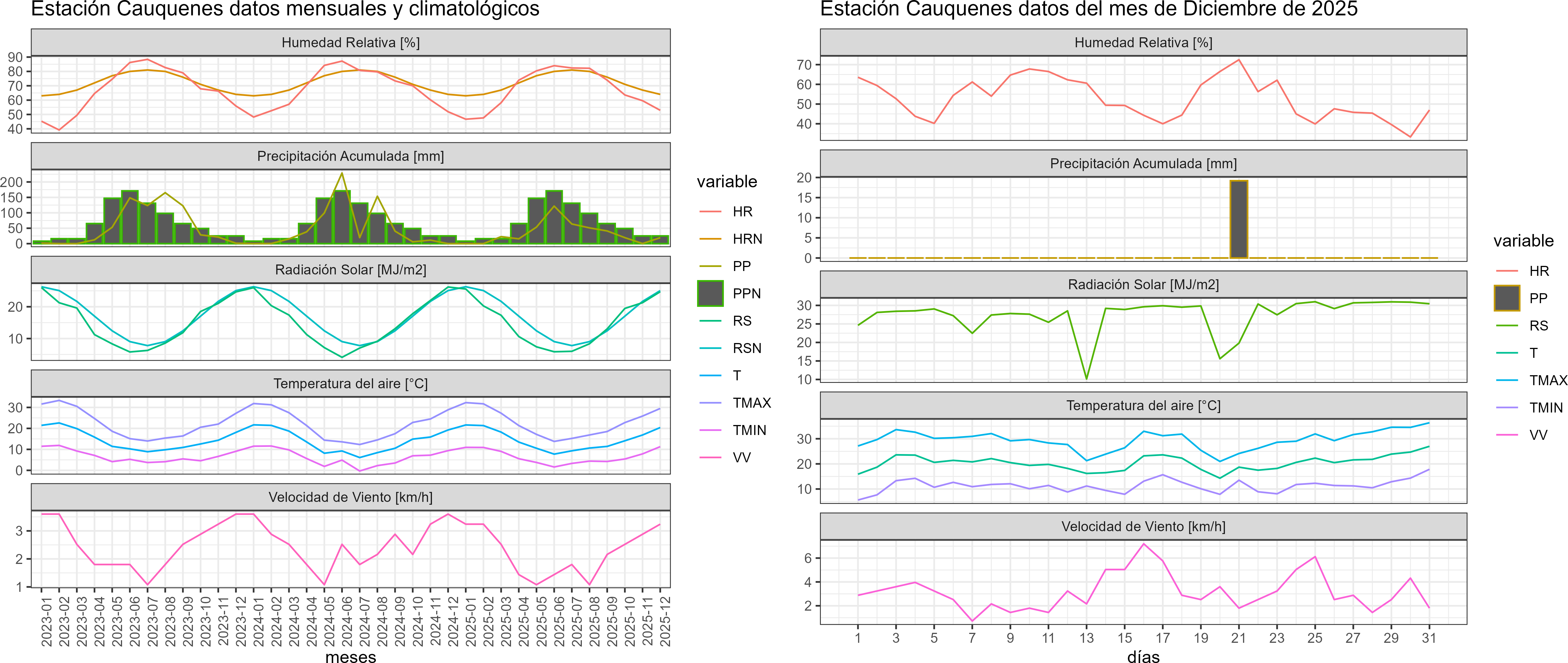 La estación Cauquenes corresponde al distrito agroclimático 7-8-3. Para este distrito climático la temperatura mínima, media y máxima climatológicas alcanzan los 9.4°C, 18.7°C y 28.1°C respectivamente. Por su parte, respecto a las temperaturas medidas durante el mes de diciembre en la estación: la temperatura mínima alcanzo los 11.3°C (1.9°C sobre la climatológica), la temperatura media 20.4°C (1.7°C sobre la climatológica) y la temperatura máxima llegó a los 29.5°C (1.4°C sobre la climatológica). En el mes de diciembre se registró una pluviometría de 19.2 mm, lo cual representa un 213.3% con respecto al mismo mes de un año normal. De enero a diciembre se ha registrado un total acumulado de 408.4 mm, en circunstancias que un año normal registraría a la fecha 730 mm, lo que representa un déficit de 44.1%. A la misma fecha, durante el año 2024 la precipitación alcanzaba los 0 mm.
