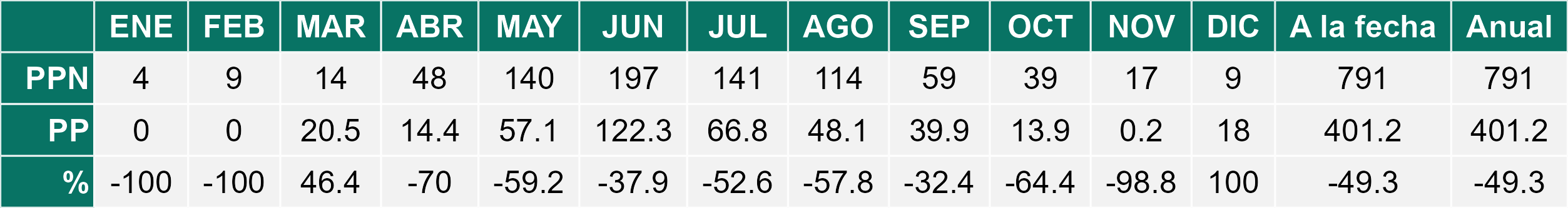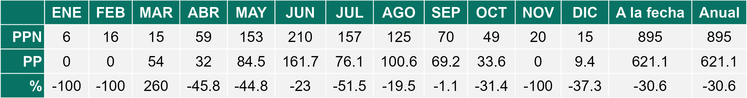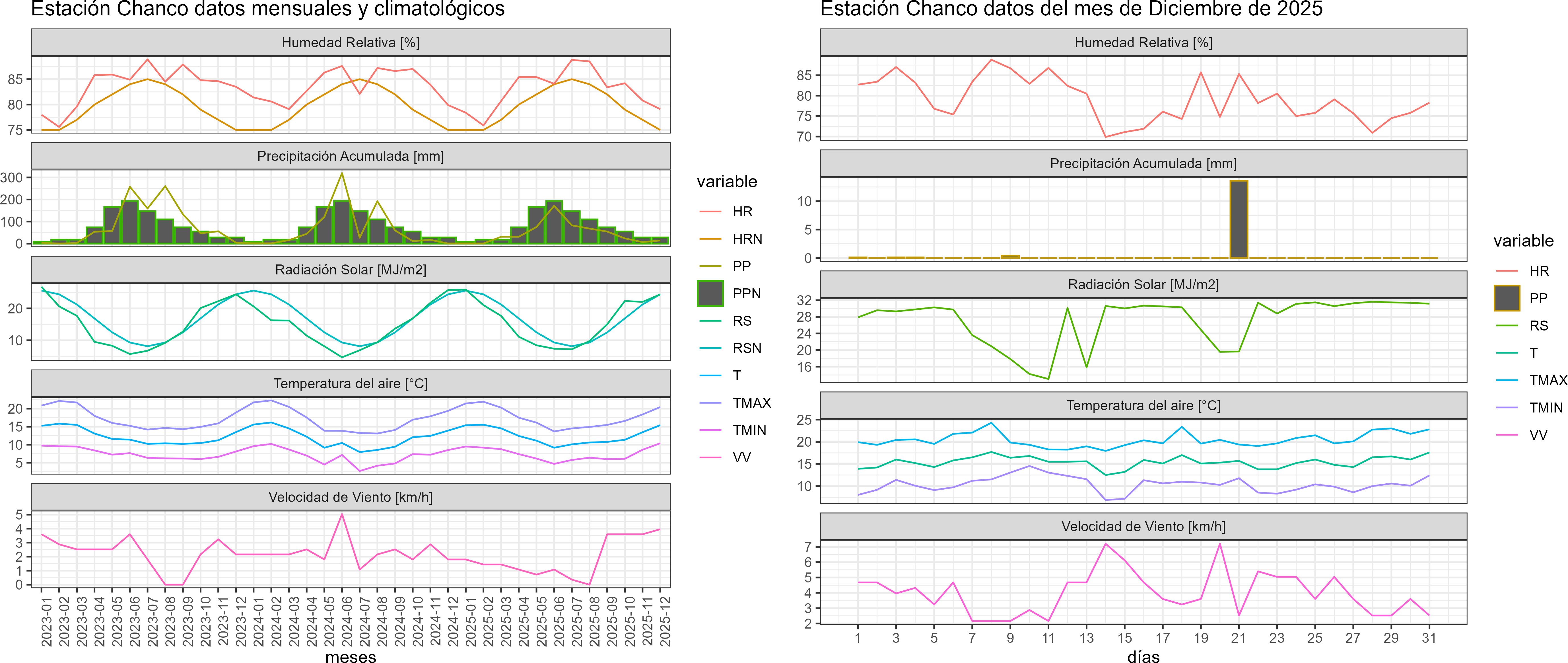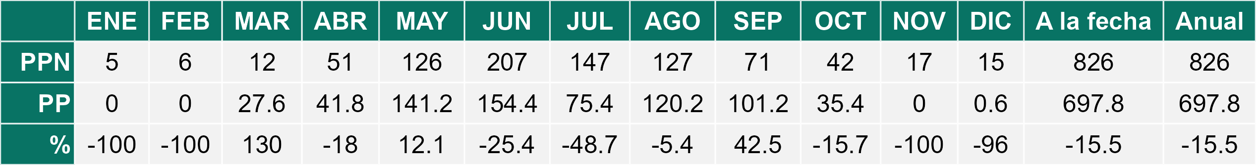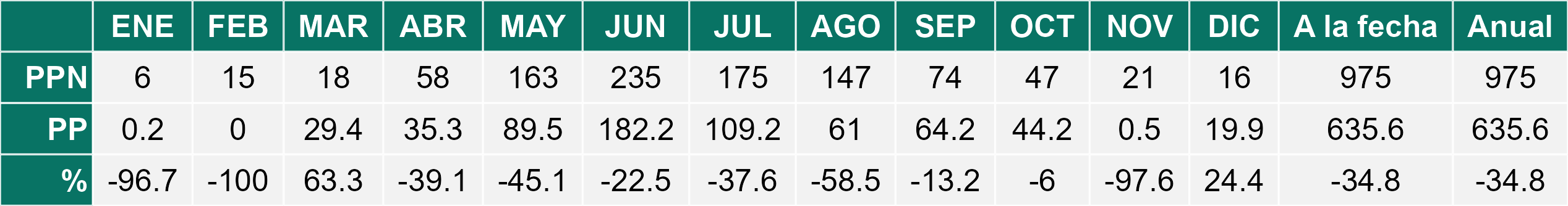 La estación Miraflores corresponde al distrito agroclimático 7-8-4. Para este distrito climático la temperatura mínima, media y máxima climatológicas alcanzan los 10.6°C, 19.8°C y 29°C respectivamente. Por su parte, respecto a las temperaturas medidas durante el mes de diciembre en la estación: la temperatura mínima alcanzo los 12.8°C (2.2°C sobre la climatológica), la temperatura media 21.6°C (1.8°C sobre la climatológica) y la temperatura máxima llegó a los 30.6°C (1.6°C sobre la climatológica). En el mes de diciembre se registró una pluviometría de 0 mm, lo cual representa un 0% con respecto al mismo mes de un año normal. De enero a diciembre se ha registrado un total acumulado de 556.5 mm, en circunstancias que un año normal registraría a la fecha 778 mm, lo que representa un déficit de 28.5%. A la misma fecha, durante el año 2024 la precipitación alcanzaba los 0 mm.