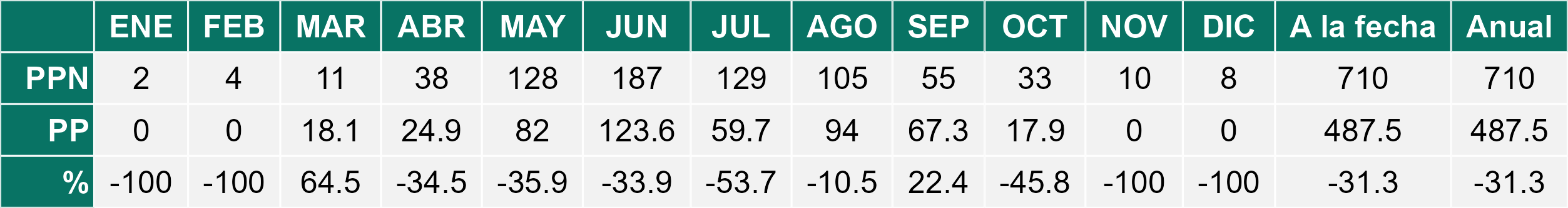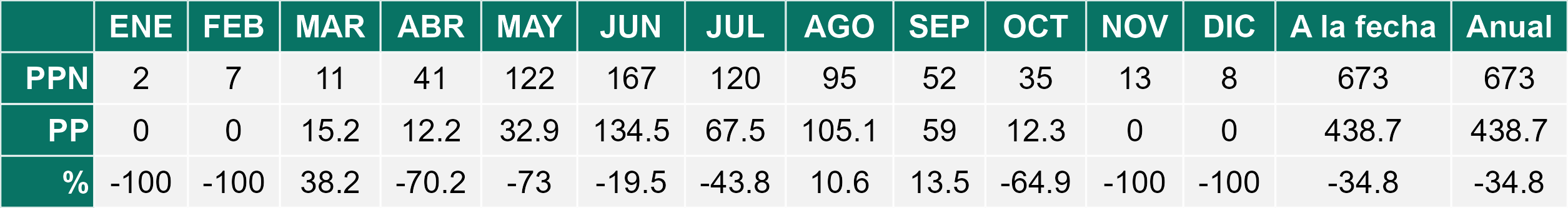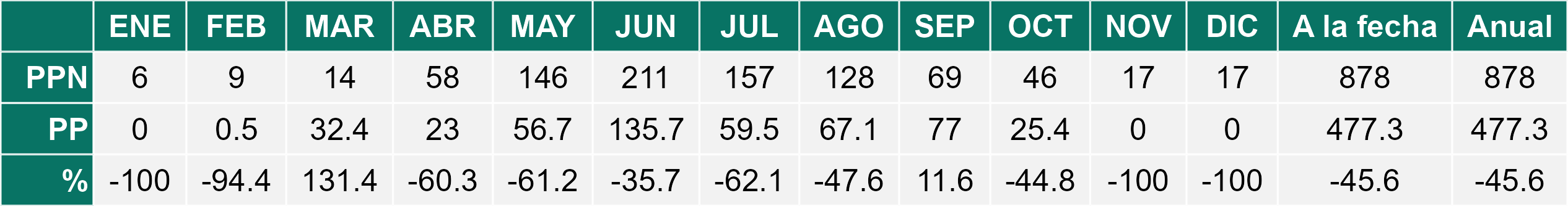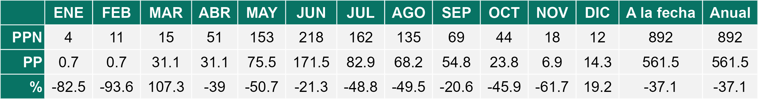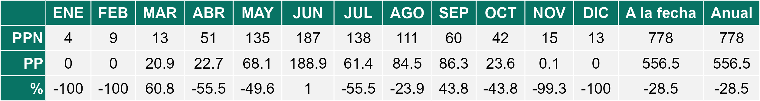 La estación Miraflores corresponde al distrito agroclimático 7-8-4. Para este distrito climático la temperatura mínima, media y máxima climatológicas alcanzan los 10.6°C, 19.8°C y 29°C respectivamente. Por su parte, respecto a las temperaturas medidas durante el mes de diciembre en la estación: la temperatura mínima alcanzo los 12.8°C (2.2°C sobre la climatológica), la temperatura media 21.6°C (1.8°C sobre la climatológica) y la temperatura máxima llegó a los 30.6°C (1.6°C sobre la climatológica). En el mes de diciembre se registró una pluviometría de 0 mm, lo cual representa un 0% con respecto al mismo mes de un año normal. De enero a diciembre se ha registrado un total acumulado de 556.5 mm, en circunstancias que un año normal registraría a la fecha 778 mm, lo que representa un déficit de 28.5%. A la misma fecha, durante el año 2024 la precipitación alcanzaba los 0 mm.
