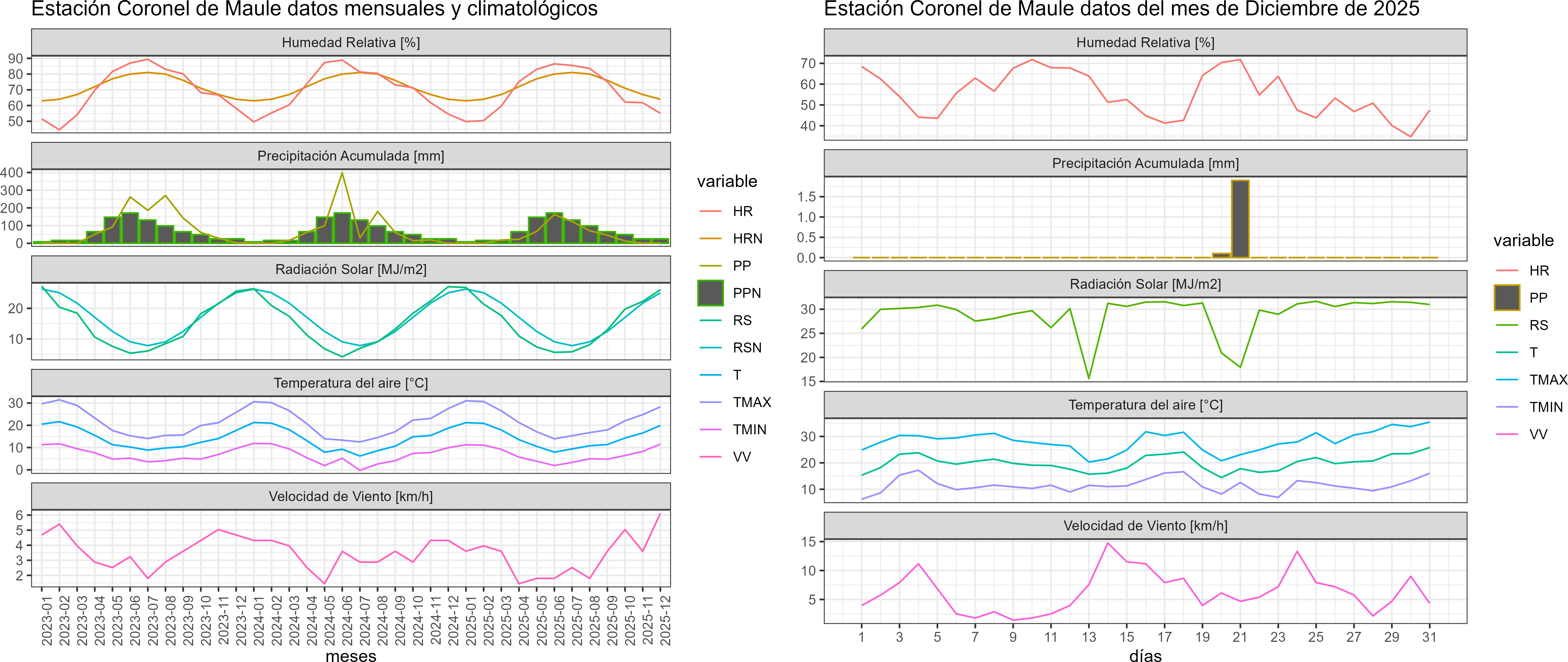 La estación Coronel de Maule corresponde al distrito agroclimático 7-8-3. Para este distrito climático la temperatura mínima, media y máxima climatológicas alcanzan los 10.1°C, 17.5°C y 24.8°C respectivamente. Por su parte, respecto a las temperaturas medidas durante el mes de diciembre en la estación: la temperatura mínima alcanzo los 11.5°C (1.4°C sobre la climatológica), la temperatura media 19.9°C (2.4°C sobre la climatológica) y la temperatura máxima llegó a los 28.3°C (3.5°C sobre la climatológica). En el mes de diciembre se registró una pluviometría de 2 mm, lo cual representa un 18.2% con respecto al mismo mes de un año normal. De enero a diciembre se ha registrado un total acumulado de 525.5 mm, en circunstancias que un año normal registraría a la fecha 899 mm, lo que representa un déficit de 41.5%. A la misma fecha, durante el año 2024 la precipitación alcanzaba los 0 mm.