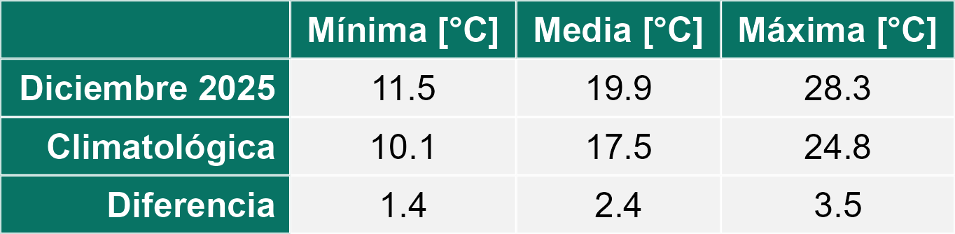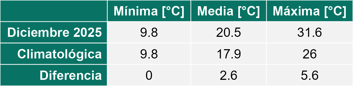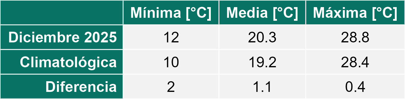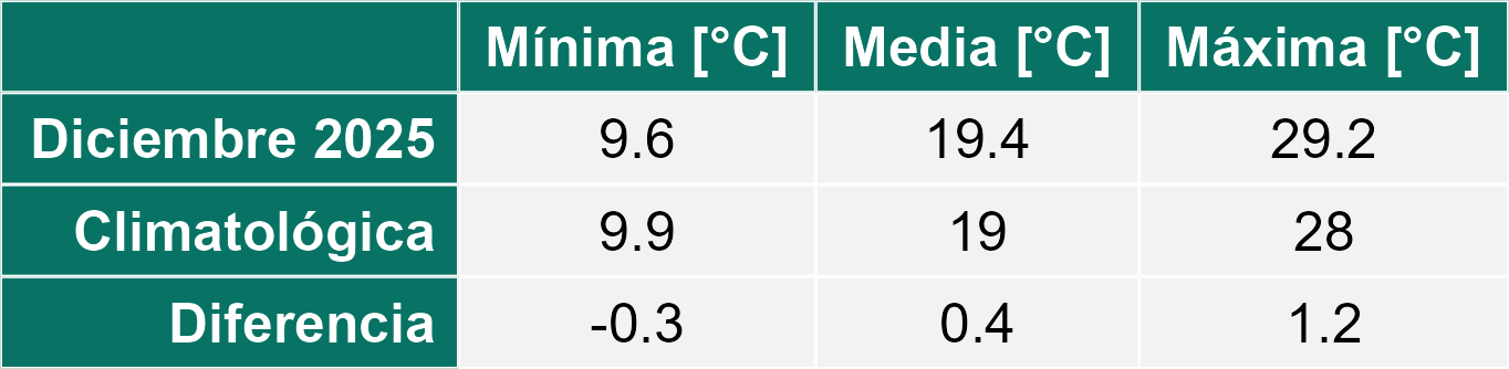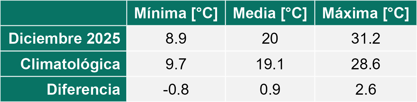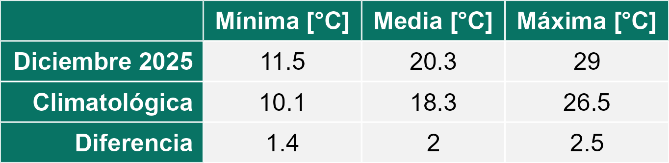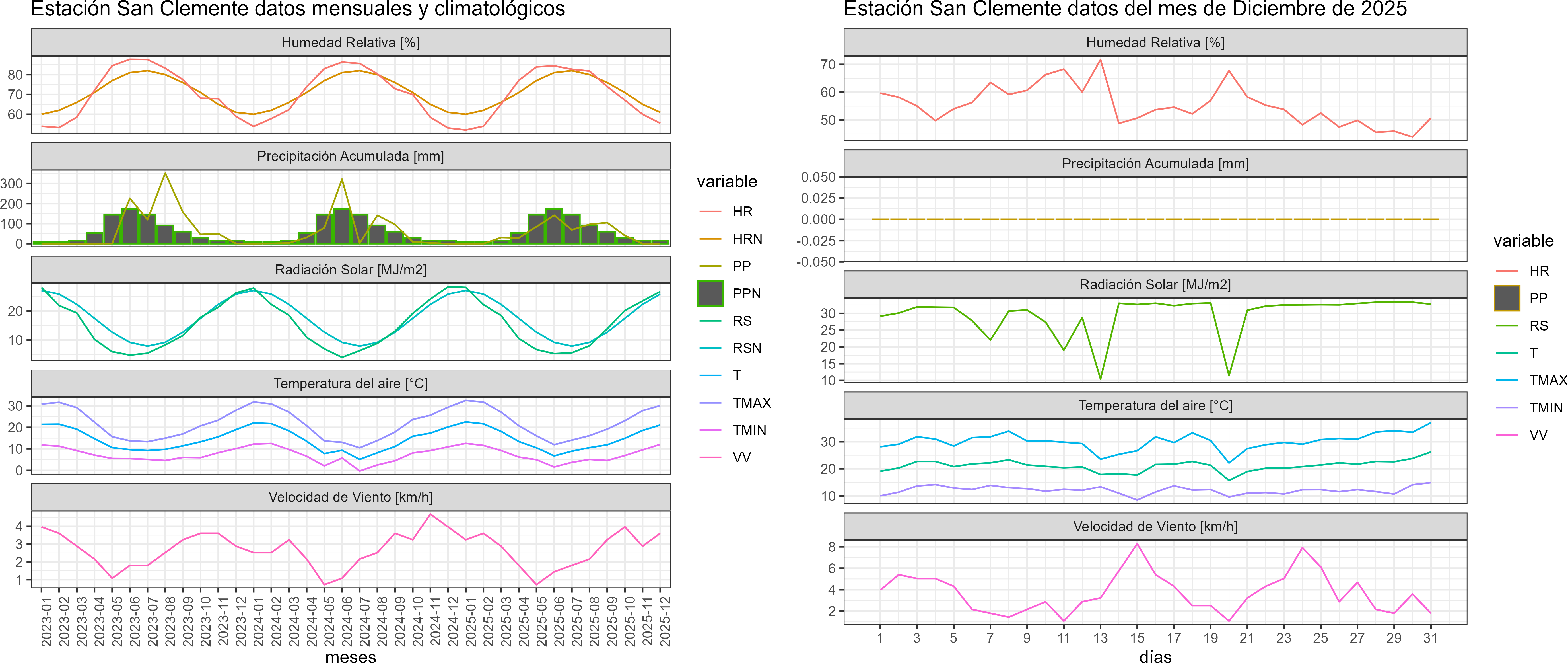 La estación San Clemente corresponde al distrito agroclimático 6-7-4. Para este distrito climático la temperatura mínima, media y máxima climatológicas alcanzan los 10.1°C, 19.5°C y 29°C respectivamente. Por su parte, respecto a las temperaturas medidas durante el mes de diciembre en la estación: la temperatura mínima alcanzo los 12.1°C (2°C sobre la climatológica), la temperatura media 21.1°C (1.6°C sobre la climatológica) y la temperatura máxima llegó a los 30.1°C (1.1°C sobre la climatológica). En el mes de diciembre se registró una pluviometría de 0 mm, lo cual representa un 0% con respecto al mismo mes de un año normal. De enero a diciembre se ha registrado un total acumulado de 595.5 mm, en circunstancias que un año normal registraría a la fecha 794 mm, lo que representa un déficit de 25%. A la misma fecha, durante el año 2024 la precipitación alcanzaba los 0 mm.