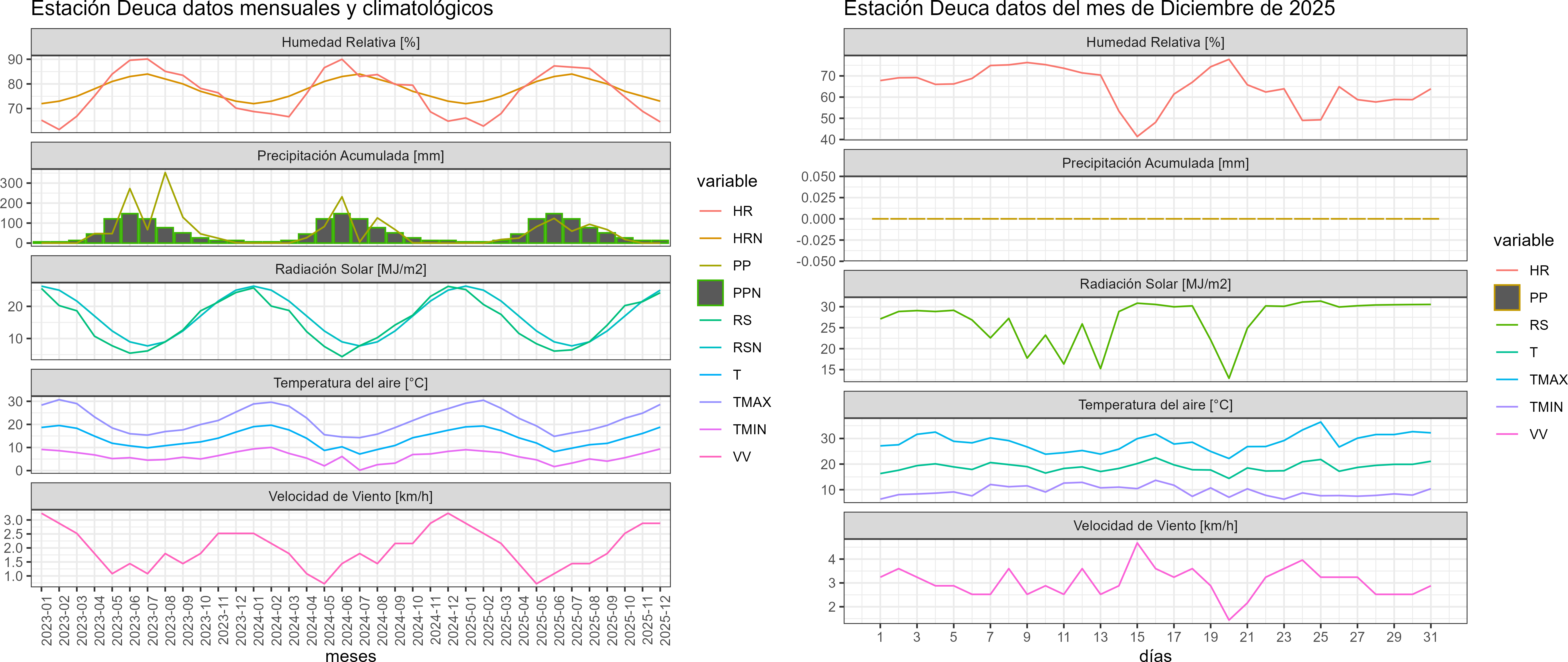 La estación Deuca corresponde al distrito agroclimático 6-7-1. Para este distrito climático la temperatura mínima, media y máxima climatológicas alcanzan los 8.8°C, 18.1°C y 27.4°C respectivamente. Por su parte, respecto a las temperaturas medidas durante el mes de diciembre en la estación: la temperatura mínima alcanzo los 9.4°C (0.6°C sobre la climatológica), la temperatura media 18.8°C (0.7°C sobre la climatológica) y la temperatura máxima llegó a los 28.6°C (1.2°C sobre la climatológica). En el mes de diciembre se registró una pluviometría de 0 mm, lo cual representa un 0% con respecto al mismo mes de un año normal. De enero a diciembre se ha registrado un total acumulado de 487.5 mm, en circunstancias que un año normal registraría a la fecha 710 mm, lo que representa un déficit de 31.3%. A la misma fecha, durante el año 2024 la precipitación alcanzaba los 0 mm.